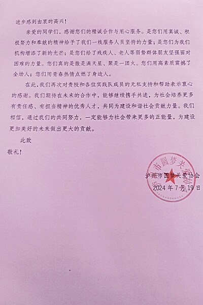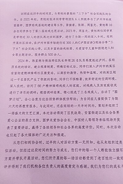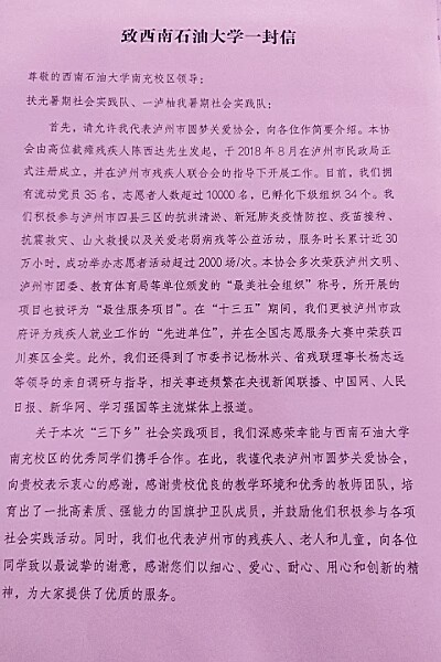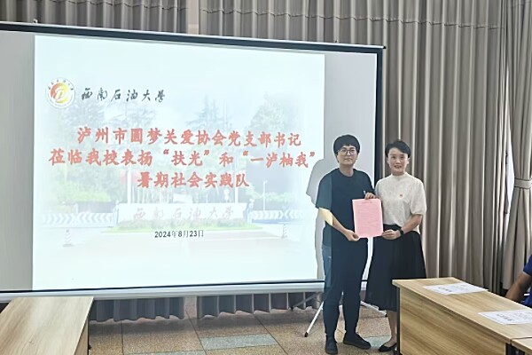 8月23日,泸州市圆梦关爱协会党支部书记李玲专程赶赴西南石油大学南充校区,为该校“扶光”与“一泸柚我”暑期社会实践队送上表扬信,并对学校在助残事业上的积极贡献给予高度赞扬。