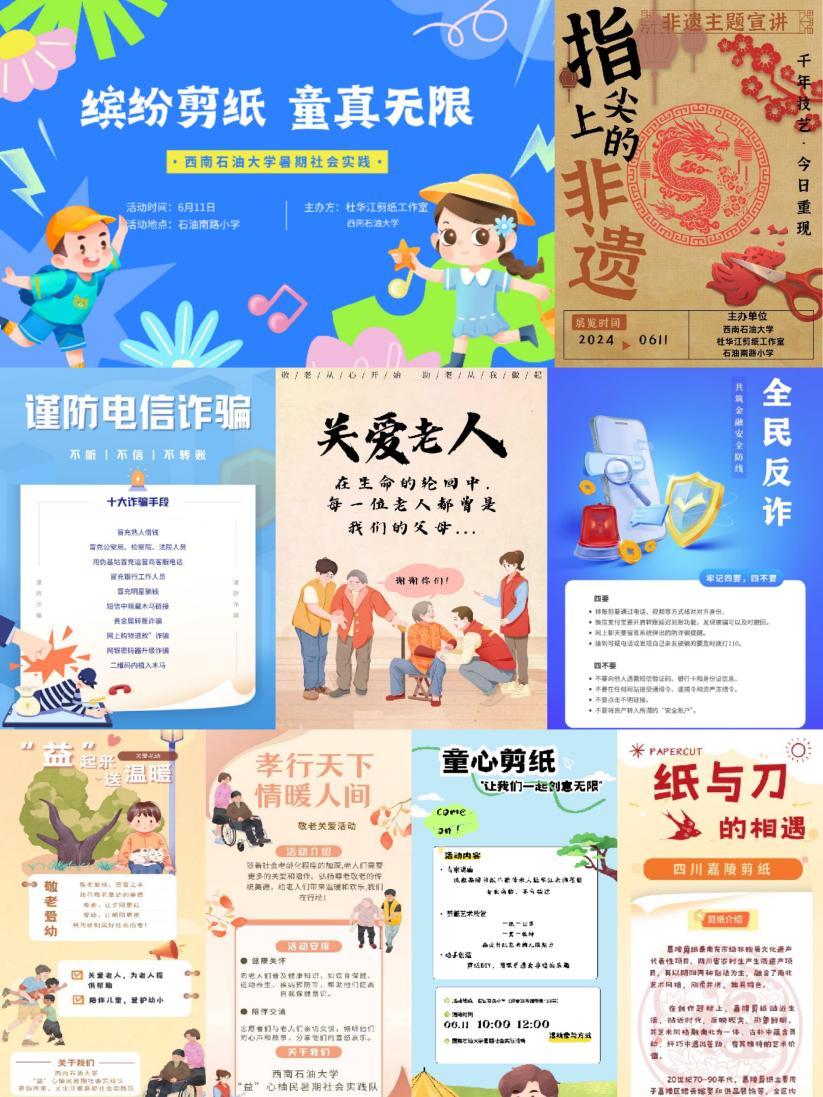 “讲”述非遗故事,“赛”出公益力量,“践”行社会担当。在石油南路小学,实践队携手南充市嘉陵剪纸非遗传承人杜华江老师,为300余名小学生带来了生动的剪纸教学课程;在双女石公园,他们积极向游客宣传嘉陵非遗剪纸,并邀请小朋友及其家长参与一对一剪纸教学公益活动,进一步扩大了非遗文化的传播范围;在杜家嘴社区,队员们针对易受骗的中老年和青少年群体,开展了反诈宣传活动。他们通过讲解电信诈骗的相关知识和重点案例,有效提升了社区居民的反诈意识,为构建平安社区贡献了自己的力量;在南充市社会福利中心,实践队开展了为期七天的公益服务活动。队员们陪伴老人,组织了手势舞教学、击鼓传花、文艺汇演等娱乐活动,让老人们感受到了社会的温暖和关怀。同时,结合前期活动经验,实践队还开展了剪纸活动、反诈宣传和光盘打卡等创意活动,进一步丰富了老人们的文化生活。