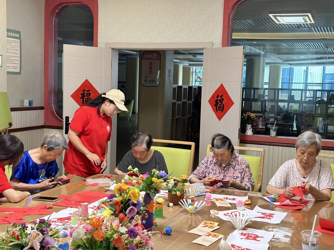 图为实践队面向老人开展剪纸教学活动