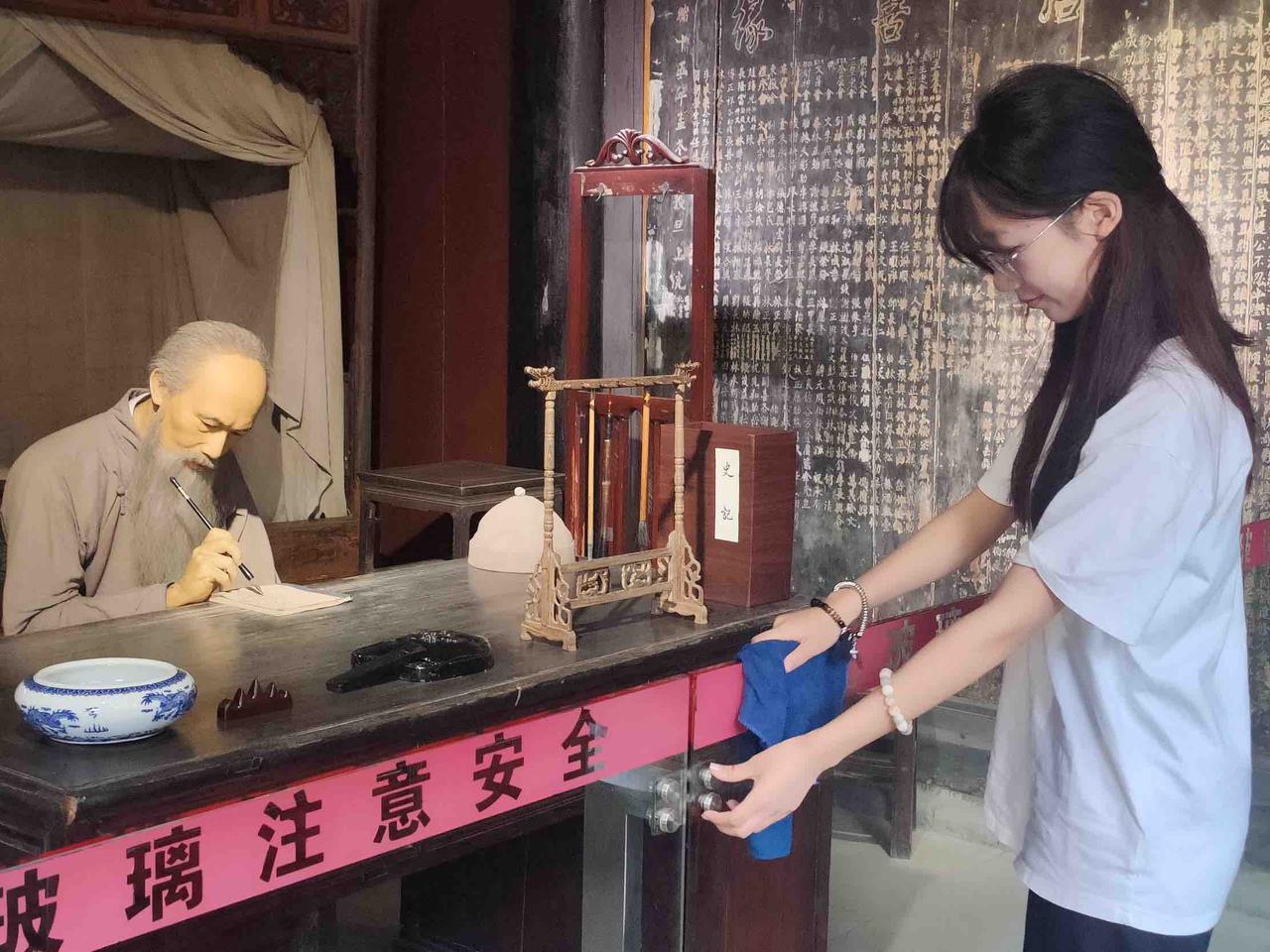 图为对张澜纪念馆展品进行清扫
