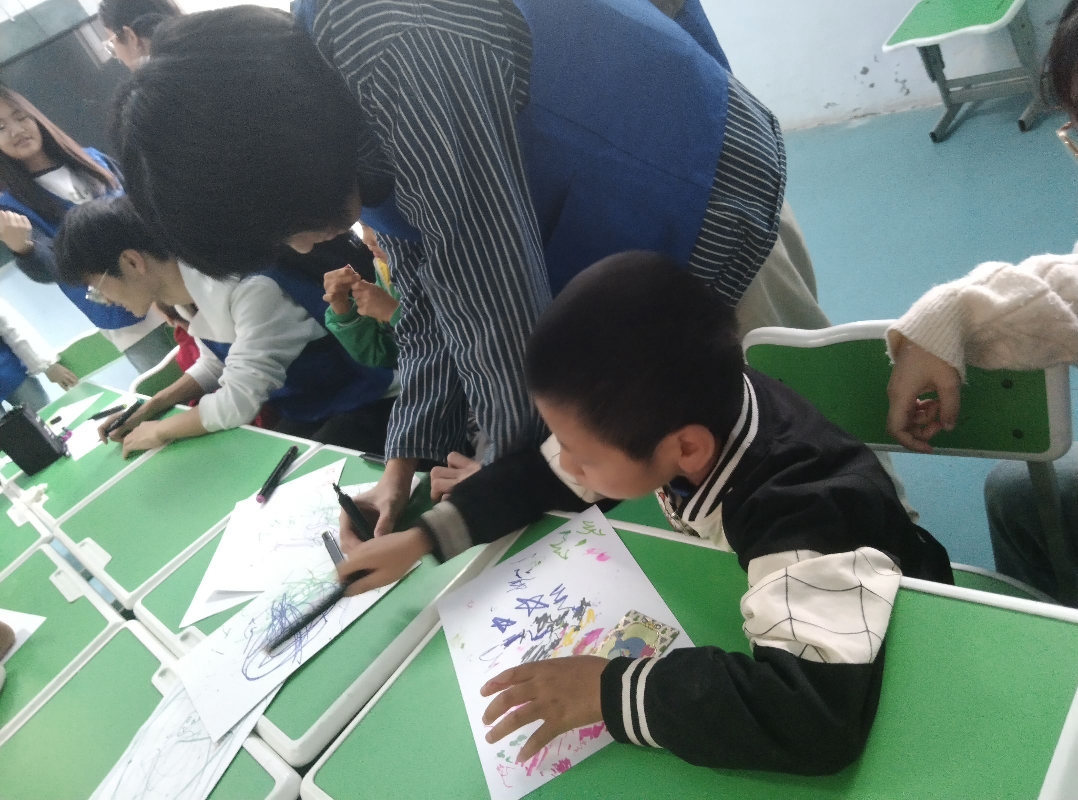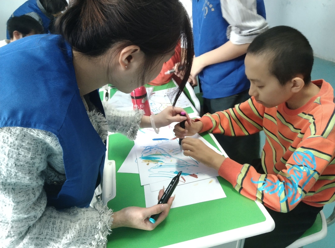 图为志愿者陪同孩子画画