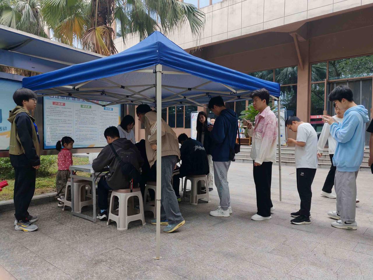 图为同学们排队等候献血