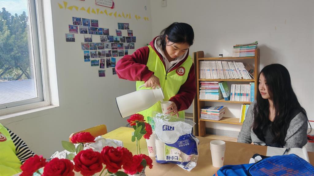 图为志愿者倒茶
