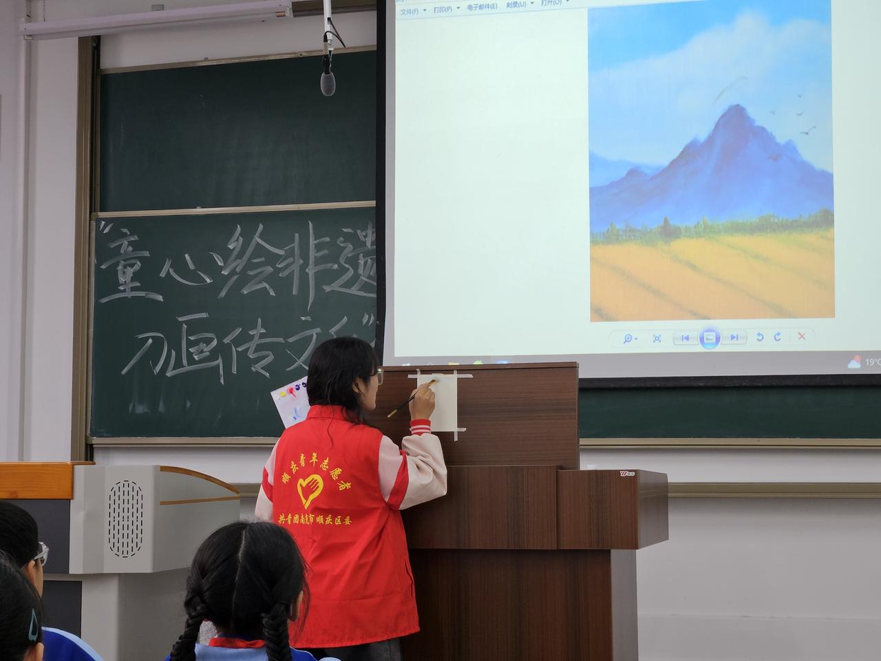 图为志愿者向孩子们讲解绘画要求