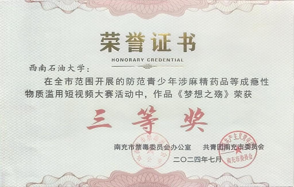 校区青年志愿者协会的作品《梦想之殇》荣获南充市三等奖。该作品聚焦于当前社会中一个严峻的问题:许多青年在不知情的情况下被陌生人下药,从而染上毒瘾。这不仅是对个体悲剧的深刻揭露,也是对观众的警示:防范毒品,从警惕陌生人的搭讪开始,增强自我保护意识,全面提高禁毒宣传的广度和深度。