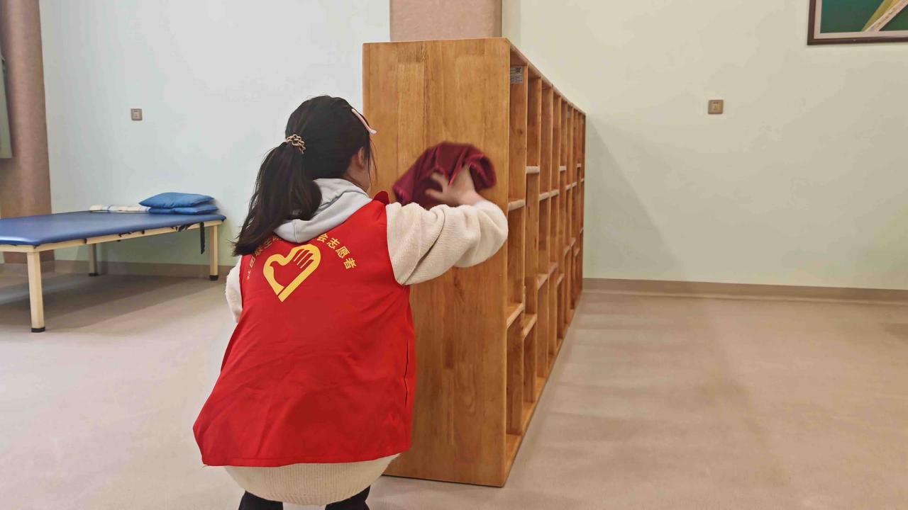 志愿者擦拭书架