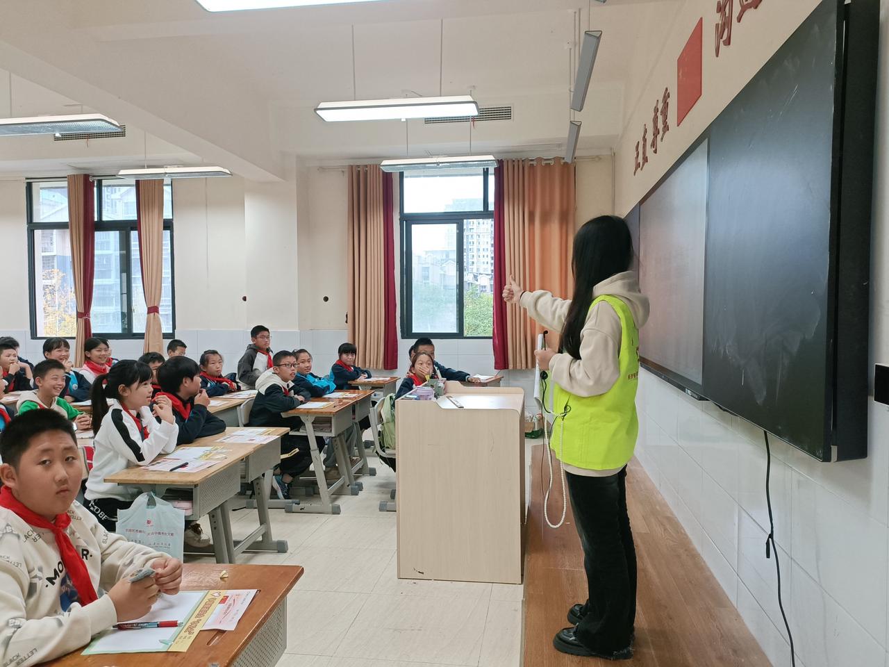 图为志愿者和同学们互动