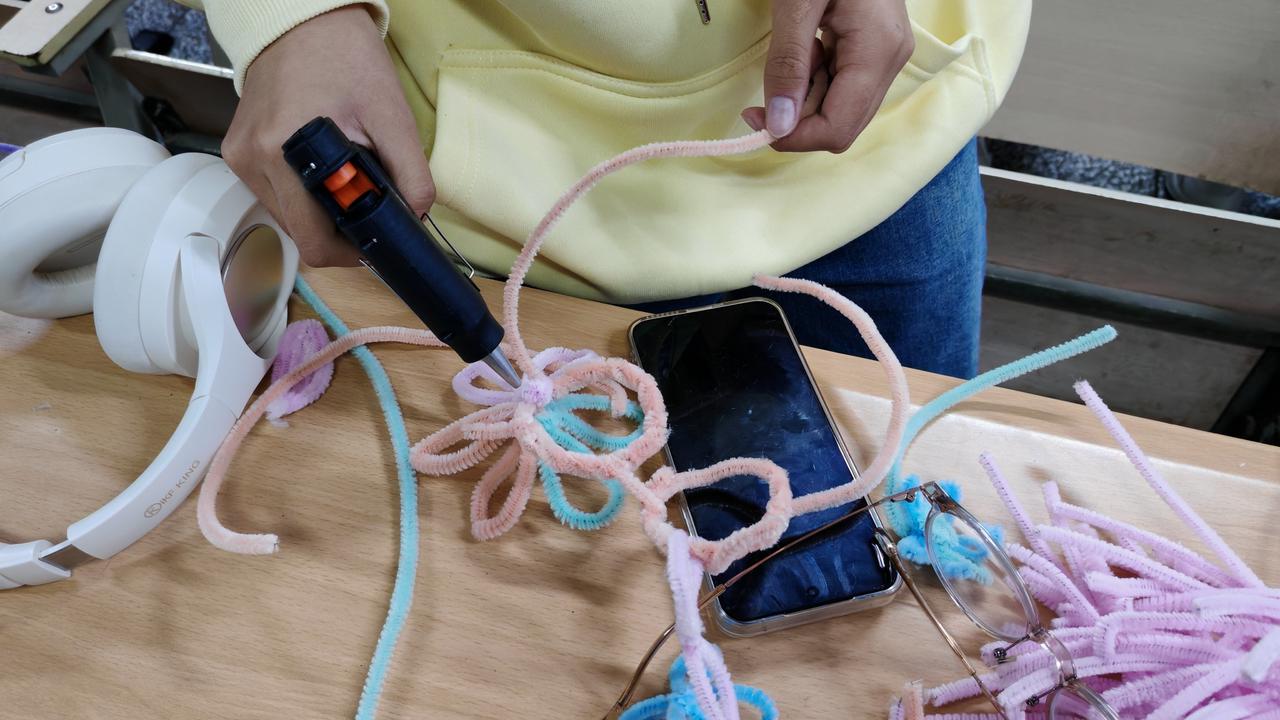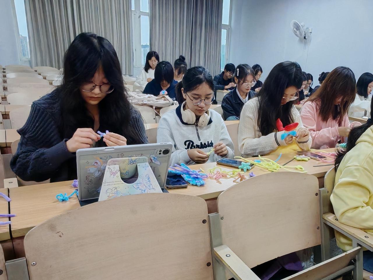 活动伊始,工作人员组织参与者们有序领取胶布、扭扭棒等手工制作材料,并为其提供扭扭棒手工艺品制作的教学视频。活动中,参与者们展现出极高的热情,认真学习视频中展示的技巧,并努力将理论知识同实践相结合,充分发挥创新思维,创作出了五彩的花朵、精巧的眼镜和精致的花瓶等独具特色的作品,充分展现了校区学子的动手能力与创新活力。制作期间,同学们彼此交流心得、互相帮助,工作人员耐心地提供指导、解答困惑,活动现场氛围和谐而美好。
