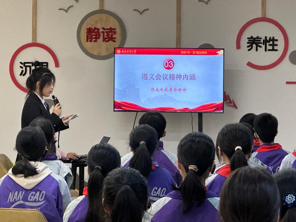 为增强青年学生爱国情怀,充分发挥红色文化资源在青年学生思想政治教育中的重要作用,近日,经济管理学院“遵义会议”宣讲团前往南充市高级中学临江校区开展了以“赓续红色血脉,共筑青春梦想”为主题的遵义会议精神宣讲活动。