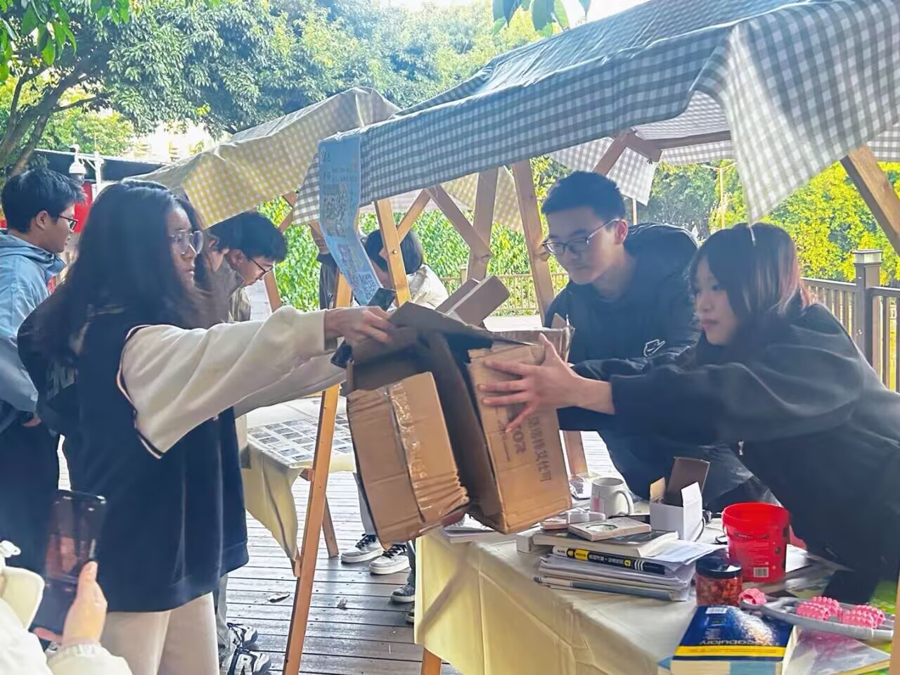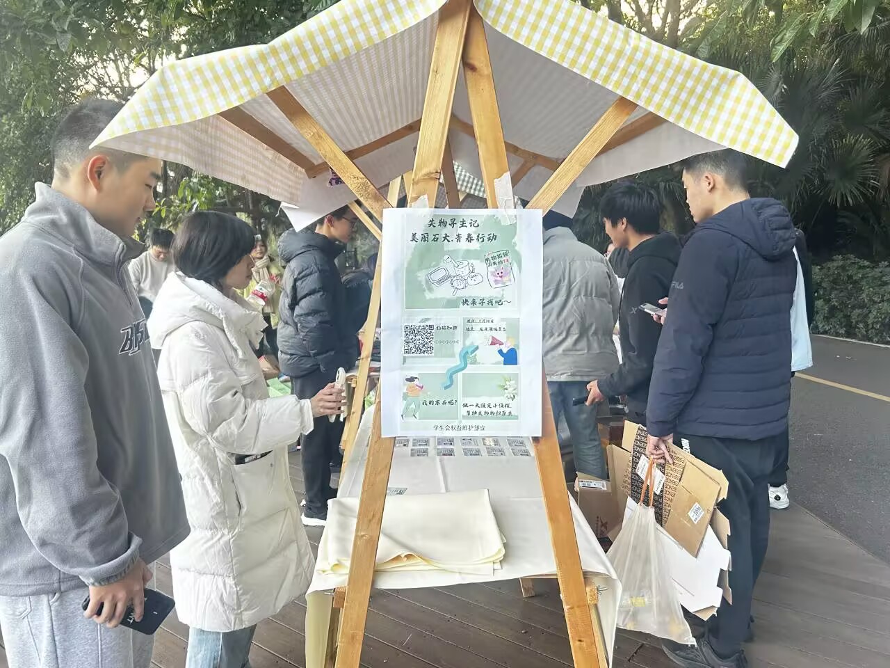 当日下午,活动在龙井湖观景台拉开帷幕,吸引了校区内众多师生的热情参与。活动分为绿色市场和失物寻主两大板块,现场布置井井有条,氛围十分热闹,体现了绿色、环保这一主题。工作人员详细介绍活动目的、规则及流程,参与者们热情高涨,纷纷投入到失物认领、绿色交易和失物寻主等活动中,活动热烈而有序地进行着。 晚上活动圆满结束,现场工作人员迅速清理场地,保持环境的整洁,对大家的热情参与和辛勤付出表达了衷心的感谢。