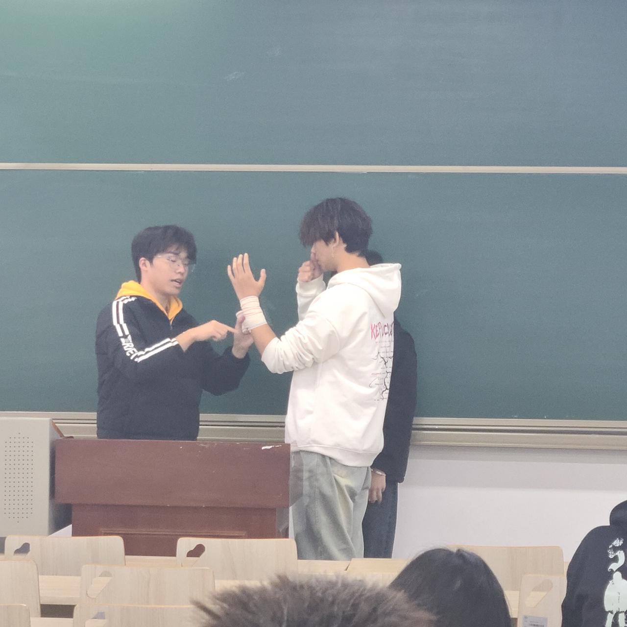 活动伊始,协会会长详细地为同学们介绍了急救的基础知识,让大家对“急救”有了更加系统、全面的认知。紧接着,会长从止血、包扎、骨折固定、伤口处理四个方面,为大家讲解了一些基础的急救处理方法。在讲解包扎时,同学们积极参与,上手实操,亲身体验了包扎的过程,学会了八字包扎法的基本动作要领。整个过程中,会长带领同学们将理论知识与实践相结合,加深了大家对创伤急救处理方法的印象。