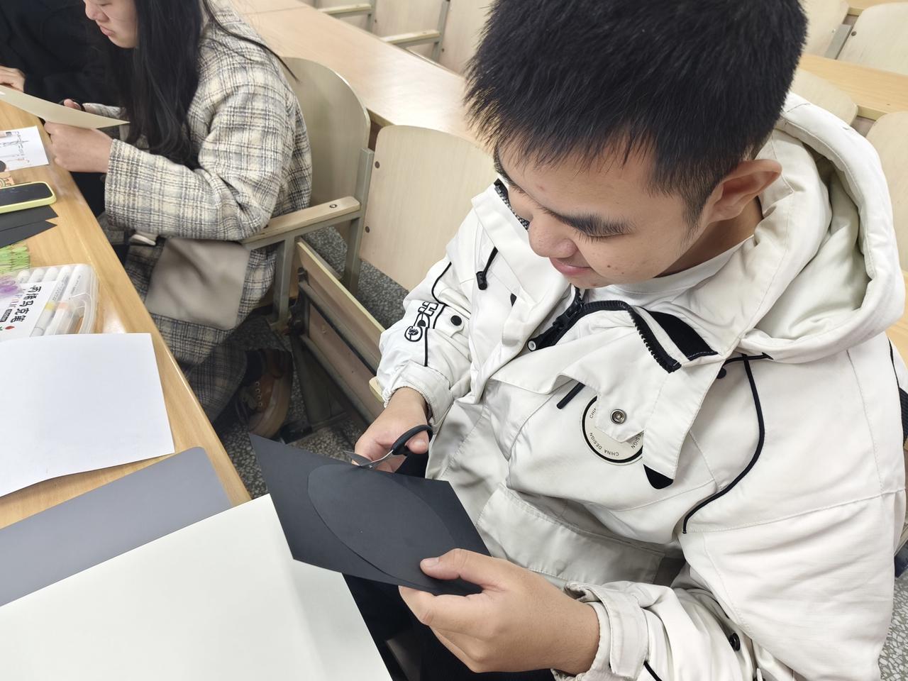 活动伊始,主讲人为同学们分发黑白卡纸、剪刀、丙烯马克笔、贴纸等制作材料。活动过程中,主讲人从选材对象、设计思路、制作小技巧等多个方面,为同学们详细讲解了“黑胶唱片”的制作流程与方法。讲解结束后,同学们立即投入到自由创作环节中。制作过程中,同学们积极发散思维,从各种音乐海报中汲取灵感,进而迸发出独特的创意,最终成功创作出了精美的各式“黑胶唱片”。