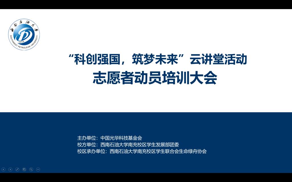 为响应国家教育发展策略,推动科技创新教育在全国地区的普及,由团中央青年发展部指导,中国光华科技基金会主办的面向全国大学生的寒假云讲堂活动正式启动,南充校区社团联生命绿舟协会积极响应开展“云讲堂”活动,并于1月24日举办线上志愿者动员大会,指导老师周花艳、唐成玉,活动执行团队及全体志愿者共计70人参与会议。