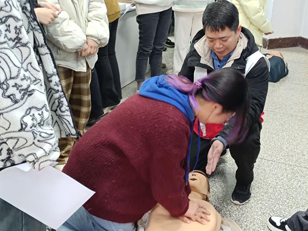 本次培训分为理论、实操和考核三个部分。培训过程中,老师就如何正确处理各种突发事件、如何正确使用除颤仪等方面展开详细讲解,并现场演示心肺复苏、止血包扎和骨折固定等操作流程。通过对急救知识的学习,学生初步了解了操作步骤,理解到应急救援的重要性。