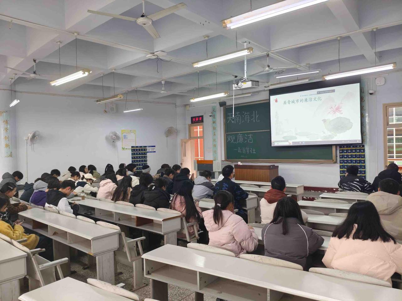 活动中,主讲人紧紧围绕活动主题,向同学们详细描述了江西省共青城市的廉洁文化建设事业。主讲介绍了江西省共青城市历来注重廉洁文化的推广,当地多所学校均举办了“12.9”反腐倡廉活动、天南海北观廉洁宣讲活动与诚信考试月宣传活动等系列廉洁教育活动。此外,共青城市还将当地传统戏曲西河曲进行改编,融入廉洁文化,新编出《清官册》《陶母诫子》等精彩曲目。在主讲人的讲解下,同学们对共青城市的廉洁文化推广有着更加深入的认识,并思考了青年与廉洁的关系以及廉洁的重要意义。