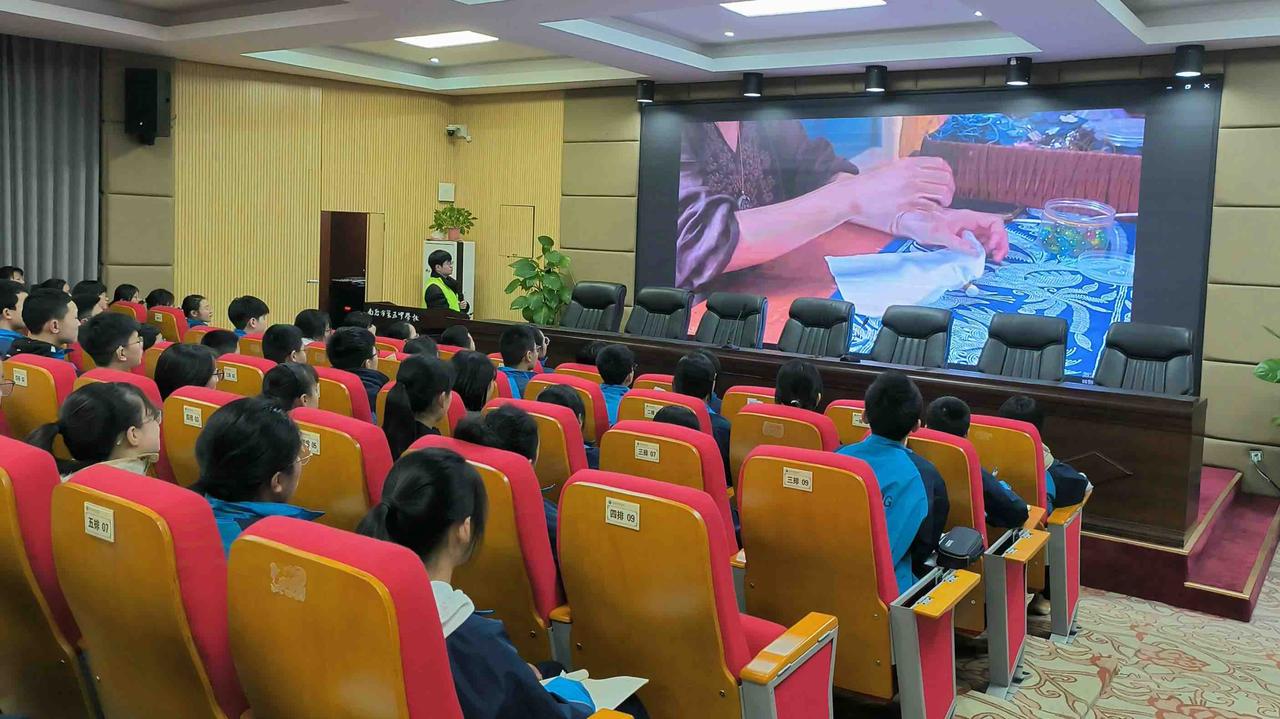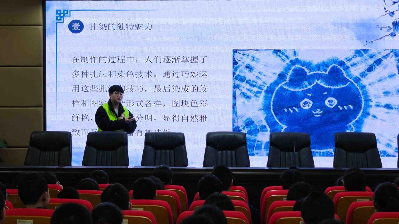 课程伊始,一段精彩的扎染讲解视频拉开了活动的帷幕。通过观看视频,同学们对扎染有了初步的了解。随后,志愿者以其起源引入介绍,深入剖析了扎染的独特纹样特点,讲解了折叠、捆扎等处理手法,最后讲述了扎染的传承与应用。活动期间,志愿者通过展示扎染成品,让同学们直观地感受到了扎染的色彩与质感,全方位领略到扎染魅力。活动结束后,志愿者也为同学们提供扎染材料,希望以讲解与实践相结合的形式,让同学们真正领悟到扎染艺术的魅力。