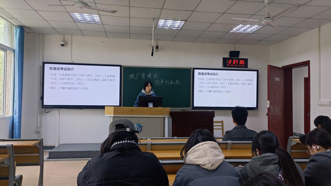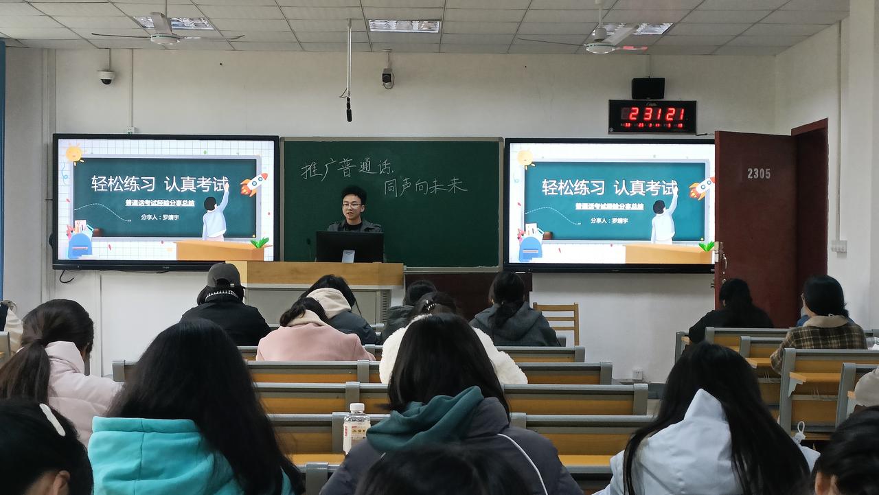 活动开始前,工作人员提前抵达现场进行准备工作。活动过程中,现场气氛热烈,志愿者们凭借自身学习经验,精心制作PPT,以通俗易懂且生动有趣的方式,分享普通话发音技巧、备考方法等实用内容。随后,工作人员播放普通话考试宣传普及视频,从普通话的历史渊源、考试的重要性、考试流程和评分标准等多个维度进行详细介绍,让参与者对普通话考试有更为全面和深入的认识。视频播放结束后,工作人员有序引导观众离场,活动在一片热烈的讨论氛围中圆满结束。