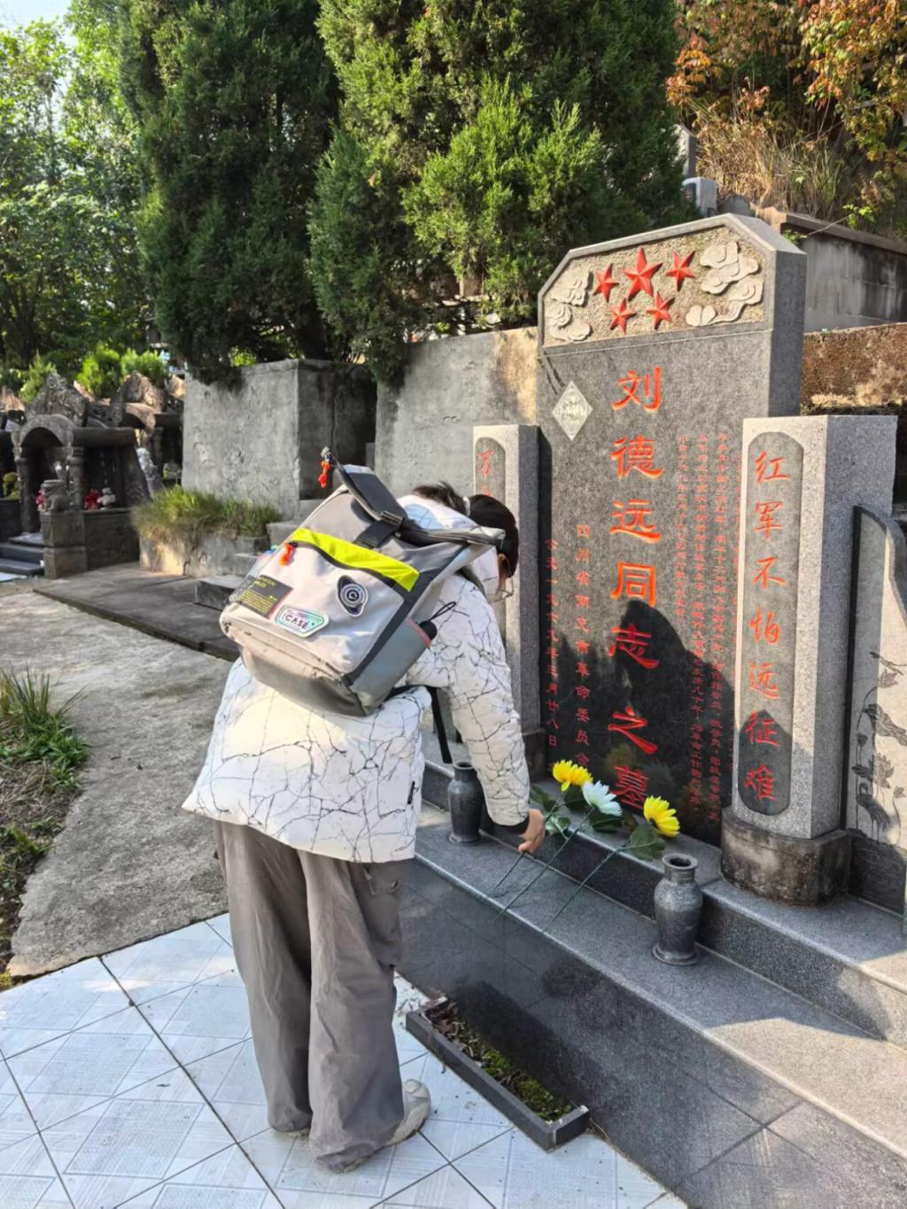 同学自发献花红军战士