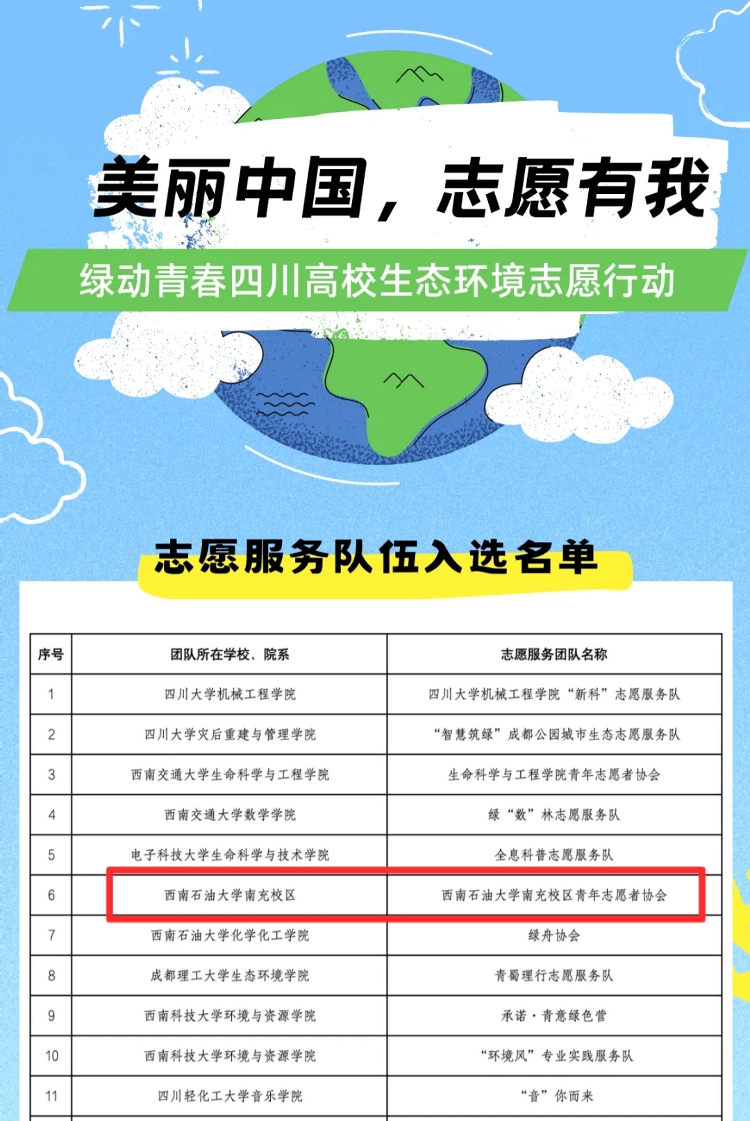 为响应团中央号召,大力推进生态环境志愿服务事业发展,引导大学生积极投身生态环境志愿服务,近日,校区青年志愿者协会成功申报并开展“美丽中国,志愿有我”——绿动青春四川高校生态环境志愿行动。