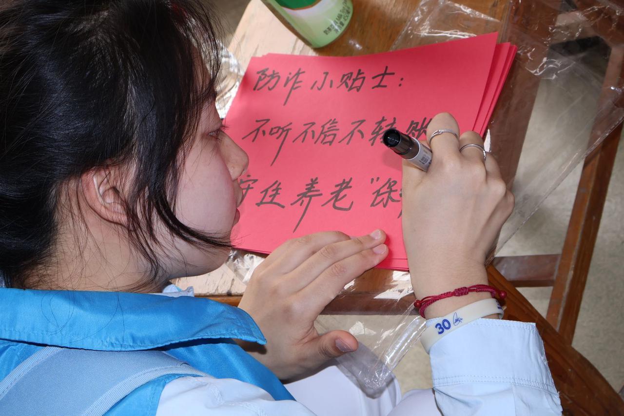 志愿者为老人书写反诈宣传标语