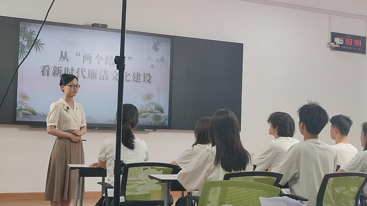 校内理论教学在第四教学楼209教室进行,邓秀娟立足当代大学生实际,从日常的消费、生活、学习等维度深度解析了廉洁文化的现代实践路径,并设置互动问答环节深化学生认知。活动最后,邓秀娟呼吁全体学生将廉洁理念融入日常学习生活,“以清正之姿担时代使命,为强国建设注入青春廉洁力量”。现场学生结合课堂内容展开了热烈讨论,围绕青年责任积极发表看法。
