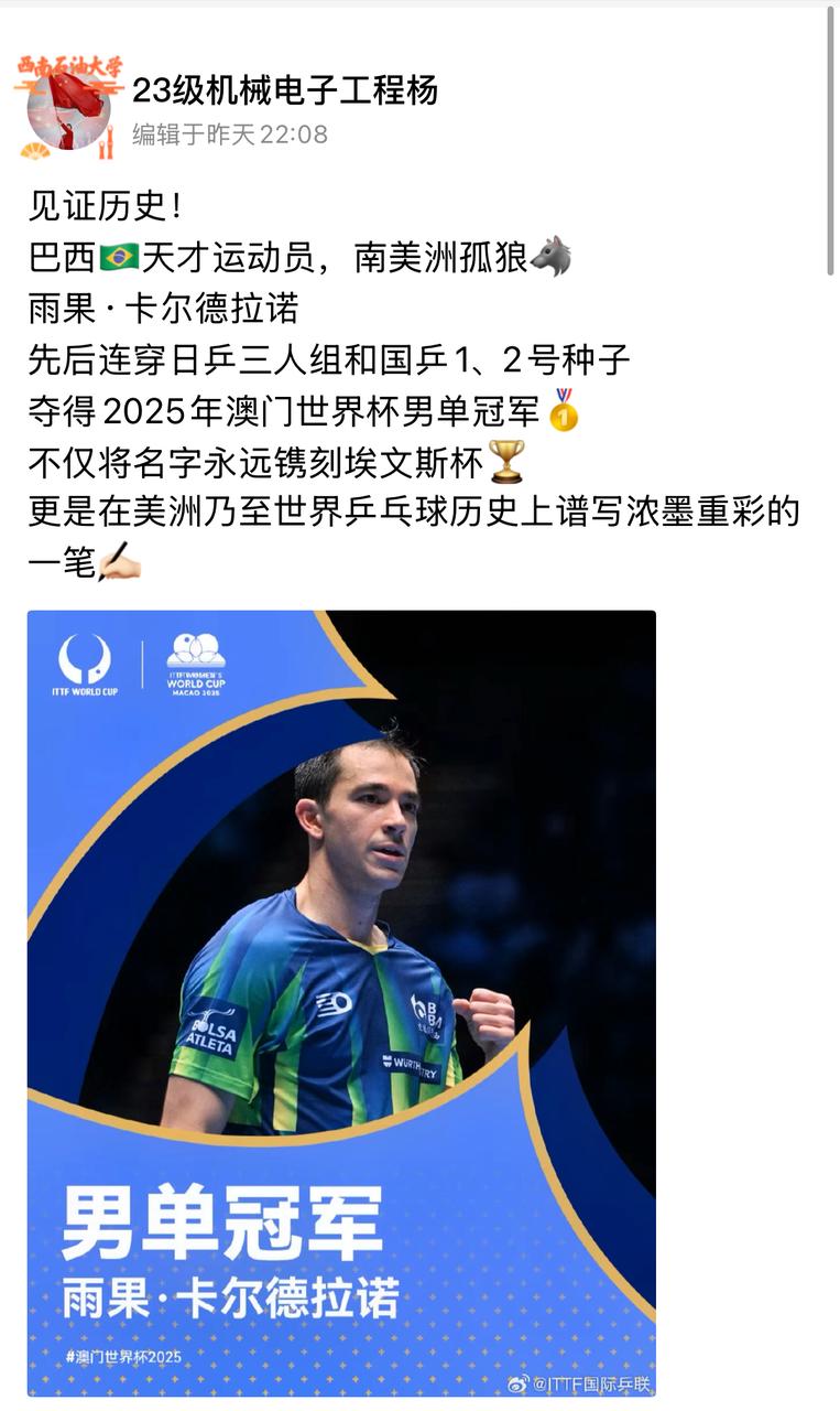 本次线上观赛注重知识性与互动性的结合。持续一周的活动既引导同学们关注运动员战术表现,也通过赛事背景科普加深了他们对乒乓球运动的理解。中国乒乓球队在本次赛事中展现强劲实力,特别是女队包揽金银铜牌的优异表现,让同学们直观感受到国球风采。