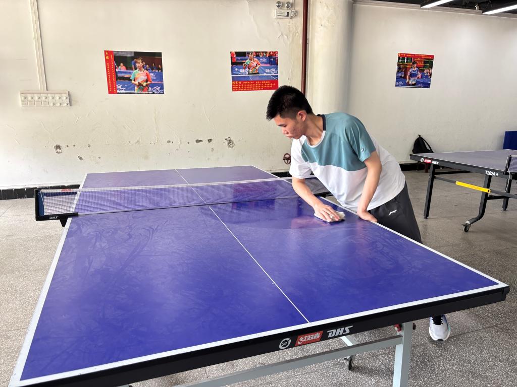 志愿者在擦拭球桌