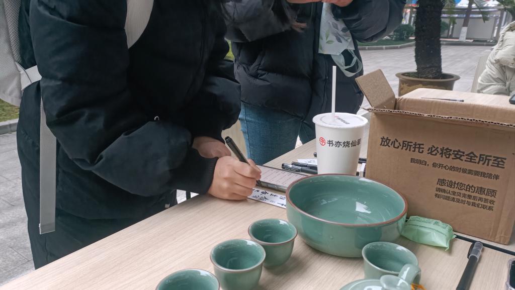 志愿者整齐摆放茶具
