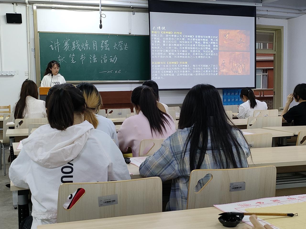 协会书画理事李竺洁为同学们解析《洛神赋》的文学与书法背景。他讲到,在文学上,曹植于黄初三年途经洛水,在政治压抑中写下这一名篇;而在书法上,赵孟頫深研“二王”,多次书写《洛神赋》以展现个人风格。除此之外,他还分享了曹植与洛神的传说,以及赵孟頫创作时情感投入的轶事,使得课堂氛围始终轻松和谐。