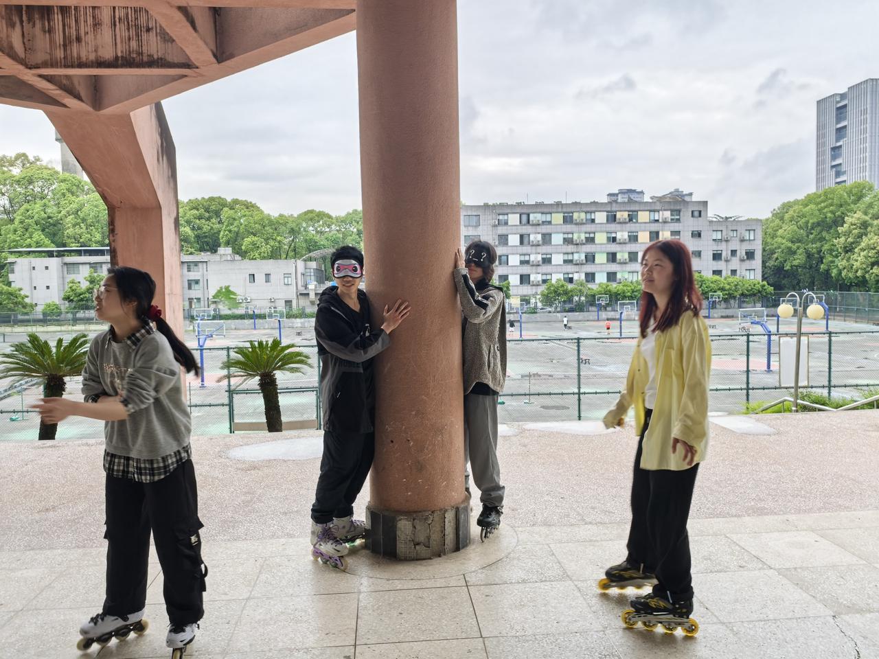 活动伊始,参与者以“扔沙包攻防战”展开竞技。攻防双方队员在滑行中结合精准投掷与灵活闪避,中间队员则使用轮滑技巧快速移动躲避攻击,现场气氛热烈。随后进行的“蒙眼抓人”环节中,参赛者蒙眼依靠听觉与滑轮操控探寻目标,既考验平衡能力又充满趣味互动。最终,“桩运接力赛”以团队协作形式展开,各组通过接力运输标志桩比拼速度与策略,决出优胜队伍。活动全程以轮滑运动为核心,通过创新规则提升趣味性,引导同学们在娱乐中锻炼自身轮滑能力。