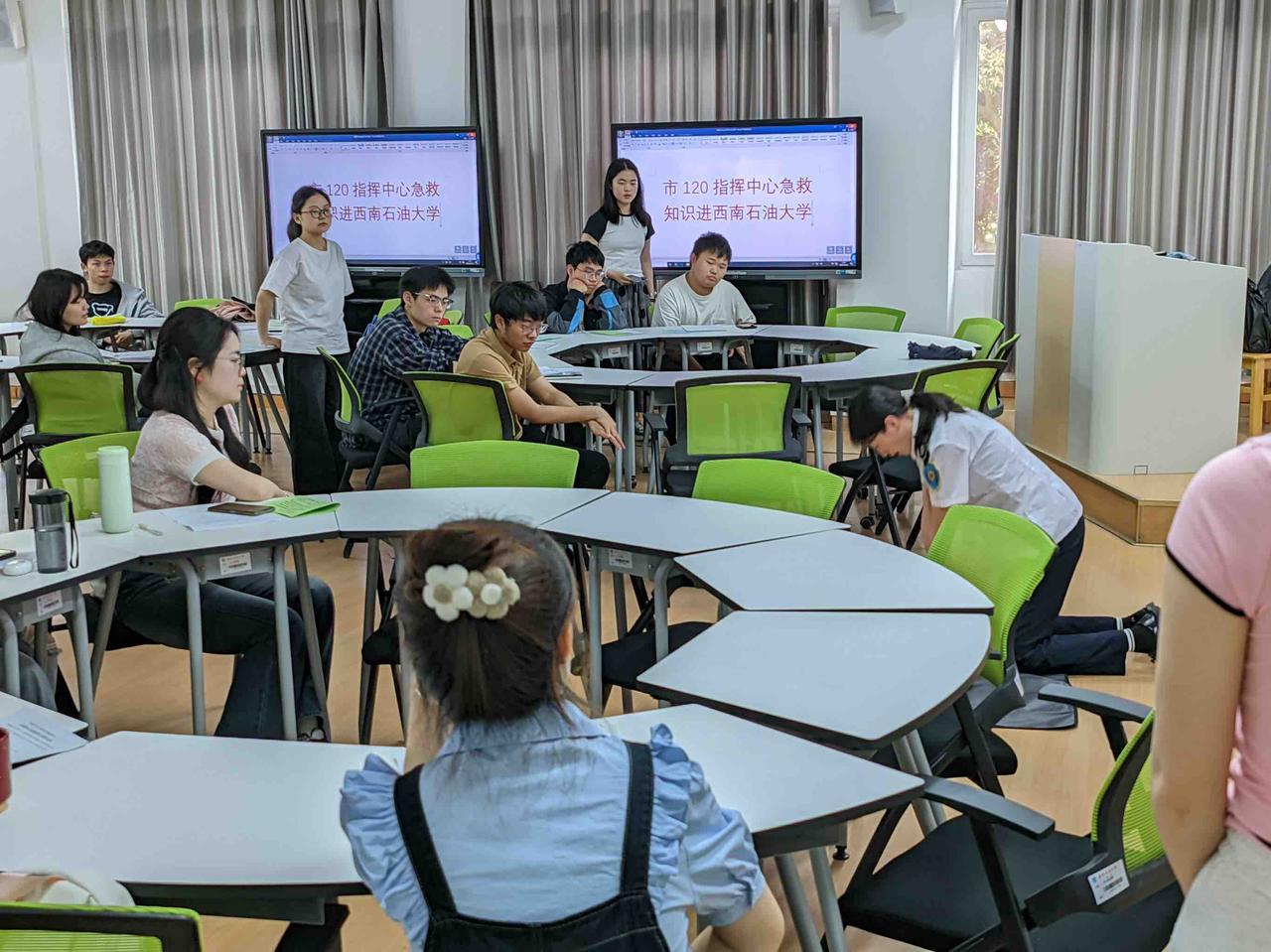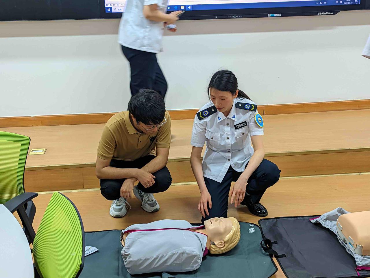 活动采用“理论授课+实操演练+情景模拟”三位一体的创新教学模式。教学中,专业的急救医护人员为我们系统讲解了心肺复苏(CPR)、气道异物梗阻处理等核心急救技能。医护人员通过图文演示和案例分析,深入剖析了操作要点。随后,参训学员分组进行实操练习,在医护人员的指导下,借助人体模型、绷带等教具反复演练急救手法,确保动作规范。最后的模拟场景环节将活动推向高潮:现场设定突发情境,学员即时实践急救方法。逼真的演练不仅检验了学习成果,更让参与者在互动中深化“黄金救援4分钟”的急救意识。