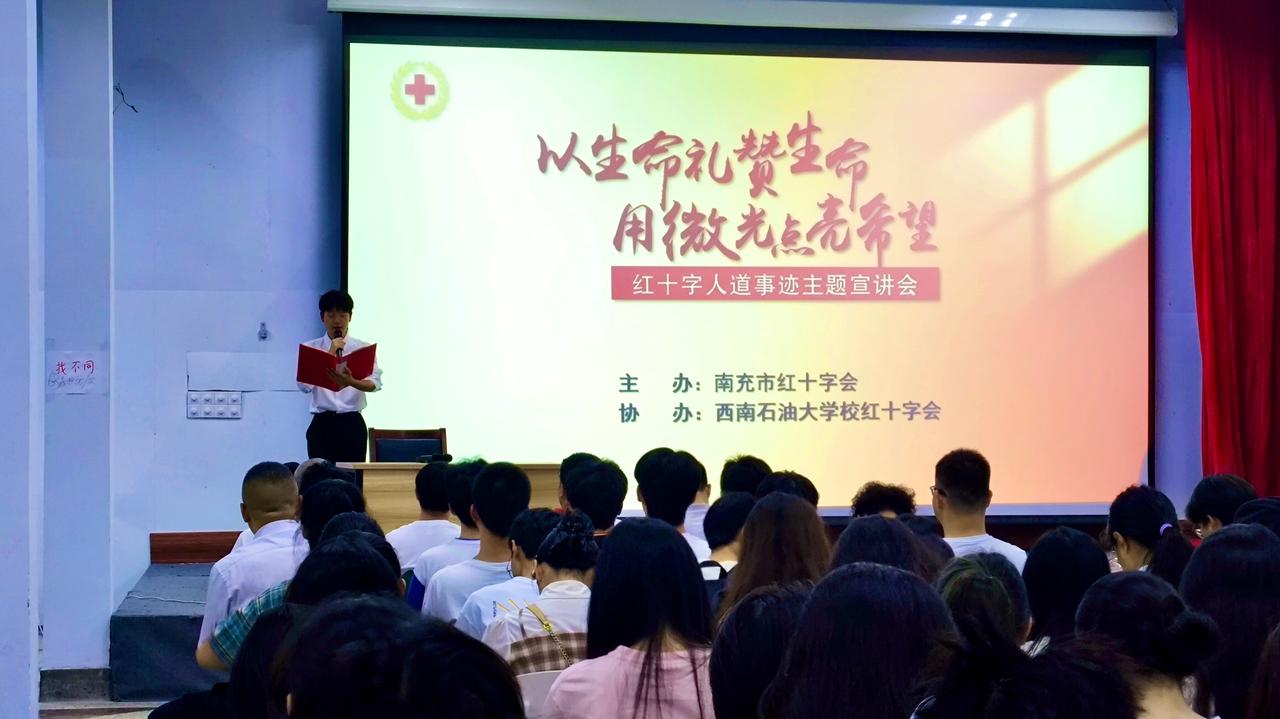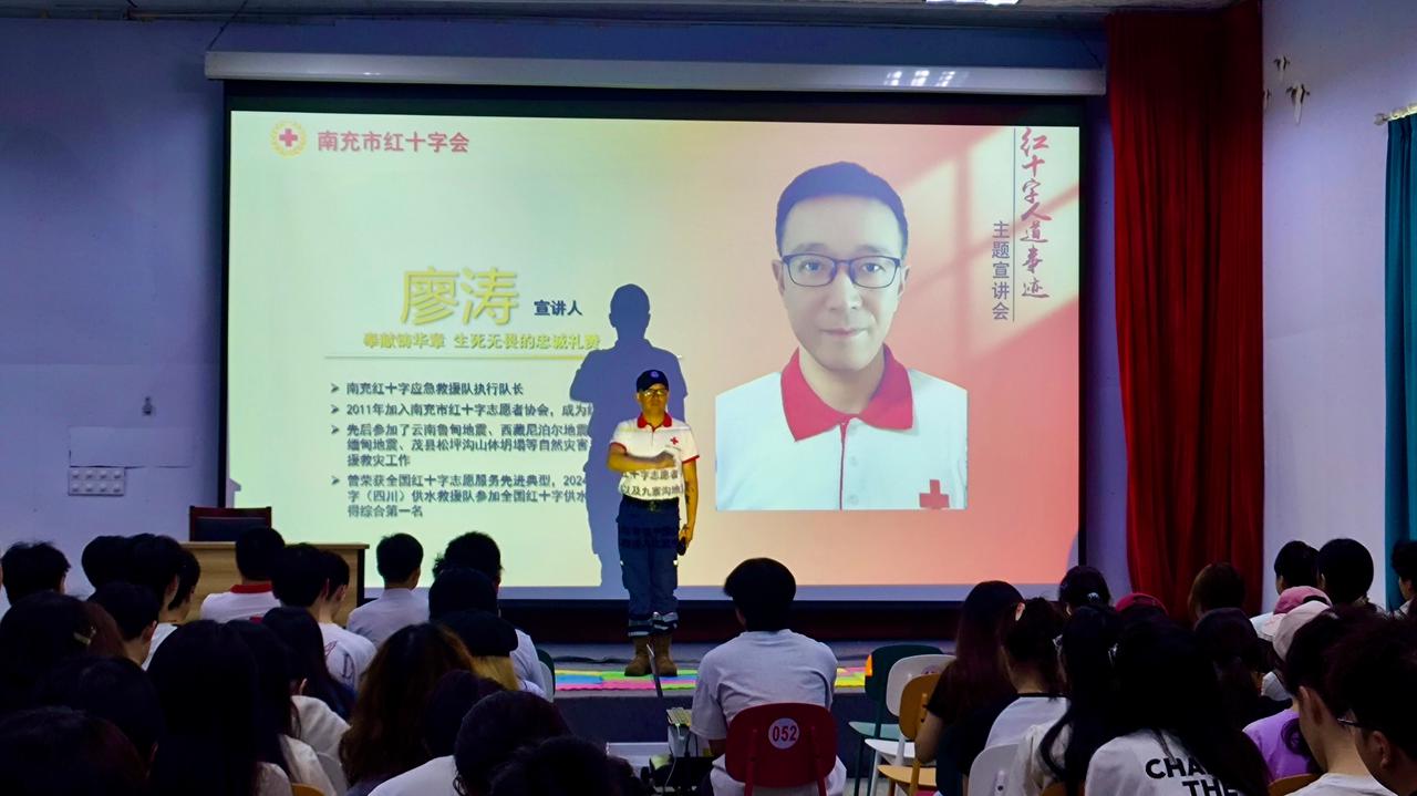 活动伊始,红十字会成员通过播放精心制作的视频,向同学们介绍了红十字会的起源、发展及其核心精神,并展示了在国内重大灾害救援中的突出贡献。随后,进入献血知识讲解环节,志愿者们通过PPT详细讲解了献血条件、流程到对身体的好处和注意事项。活动中,三位红十字志愿者代表依次分享了他们的感人故事。首先,南充红十字应急救援队队长廖涛讲述了在玉树、九寨沟等地震灾区争分夺秒救援的经历;而西华师范大学学生李通则分享了为陌生患者捐献造血干细胞的动人故事;最后,南充市三献协会会长金高峰用194次献血的坚持诠释了平凡中的伟大。这些真实的故事让同学们深受触动,许多同学表示想要加入无偿献血队伍,每个人都可以成为传递温暖的使者。
