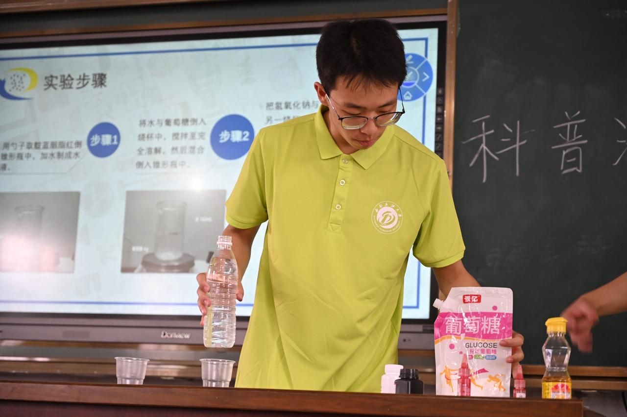 活动中,实践队员们化身“科学讲解员”,借助通俗易懂的语句与生动的图文演示,向孩子们阐释漂漆、蓝晒实验蕴含的科学知识,并展示如何运用日常物品进行实验操作。在“海底火山”和“瓶中红绿灯”实验中,队员们以贴近生活的例子介绍科学道理,鼓励小朋友们亲手实践,在实践中领略科学世界的魅力所在。