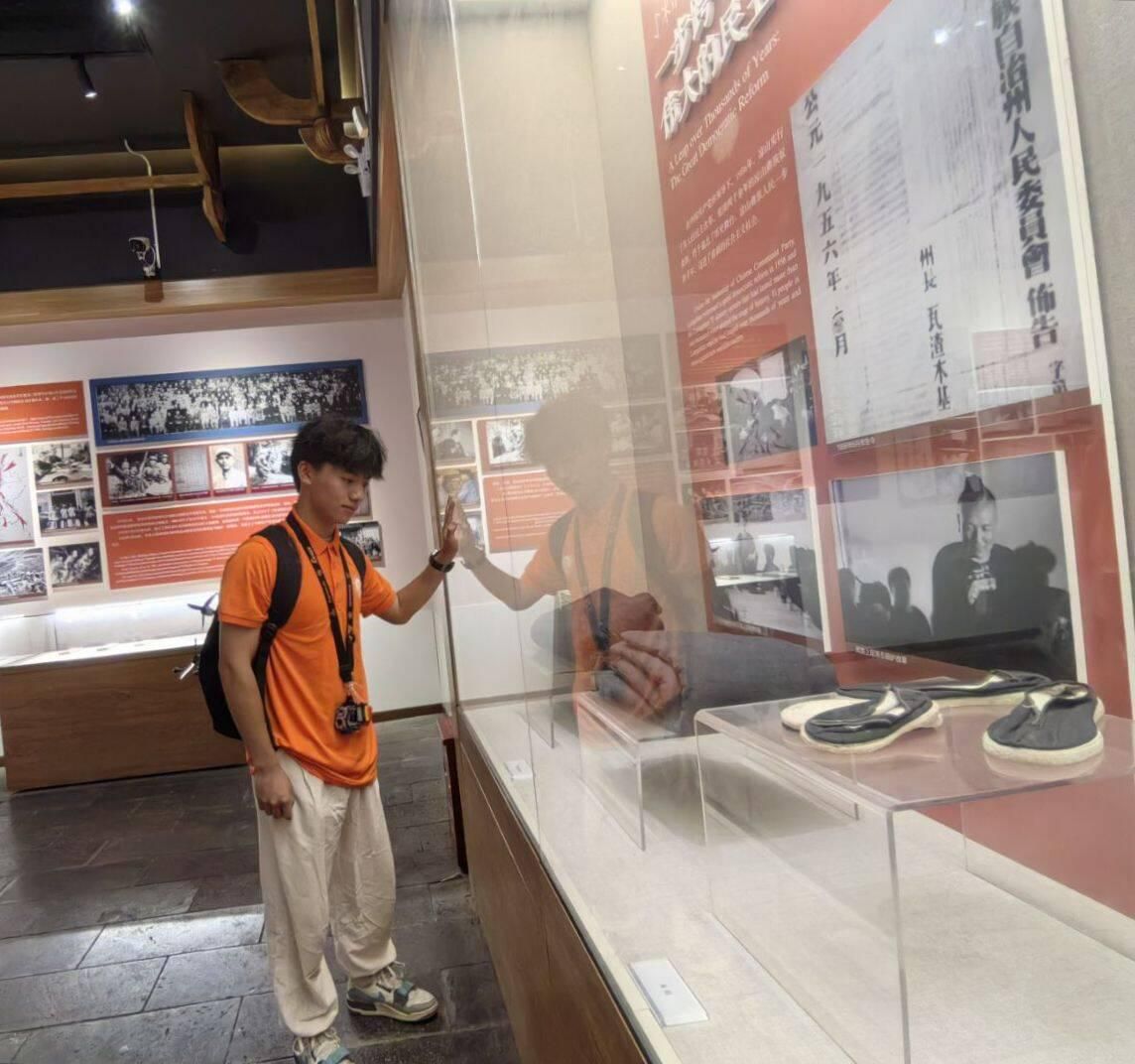 在博物馆中,团队偶遇了同样前来学习调研的攀枝花学院社会实践团队,双方一见如故,决定结伴而行,共同探索彝族文化的瑰宝。馆内丰富的陈列系统展示了彝族从远古至今的历史沿革、社会形态、生产生活、宗教信仰、语言文字、文学艺术以及独特的民俗风情,队员们系统参观了“彝族历史沿革”“民俗文化厅”“非遗传承厅” 等展区。通过珍贵的文物、生动的图片、详实的史料与逼真的场景复原,队员们“沉浸式”地触摸到彝族历史的脉络,领略其文化的博大精深与独特魅力。精美的漆器、华丽的银饰、神秘的毕摩文化、古老的彝文典籍以及承载民族记忆的节日习俗,无不加深了队员们对这片土地和人民的理解。
