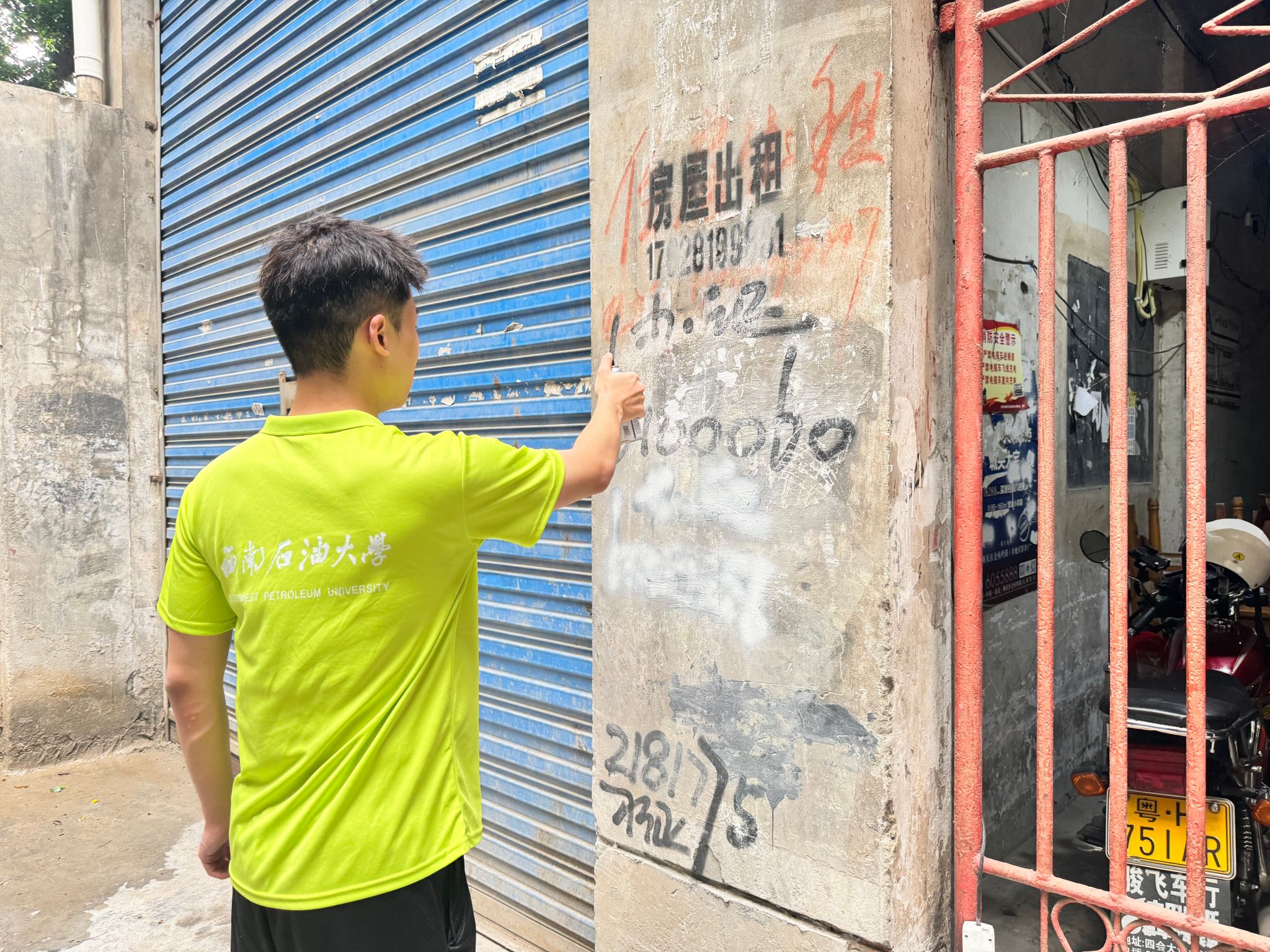 活动当天,实践队分成四个工作小组,携带铲刀、喷壶、涂料等专业工具,对社区内楼道墙面、电线杆、公示栏等公共区域的小广告进行集中清理。队员们采用“一浸二铲三粉刷”的工作方法:先用水浸湿广告贴纸,再用铲刀彻底清除,最后用涂料进行统一粉刷,确保清理工作高效彻底。