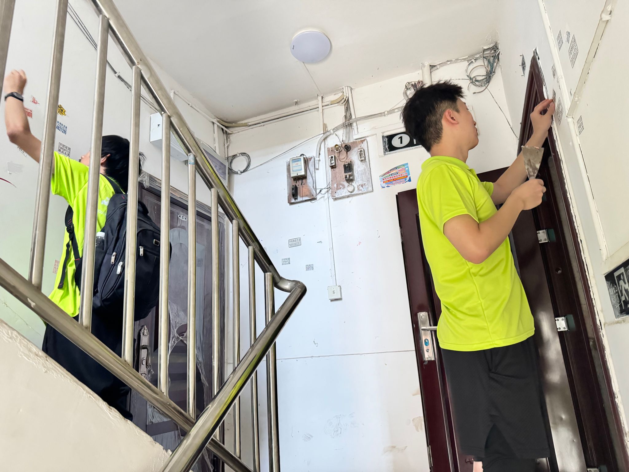 实践队员清理居民楼广告