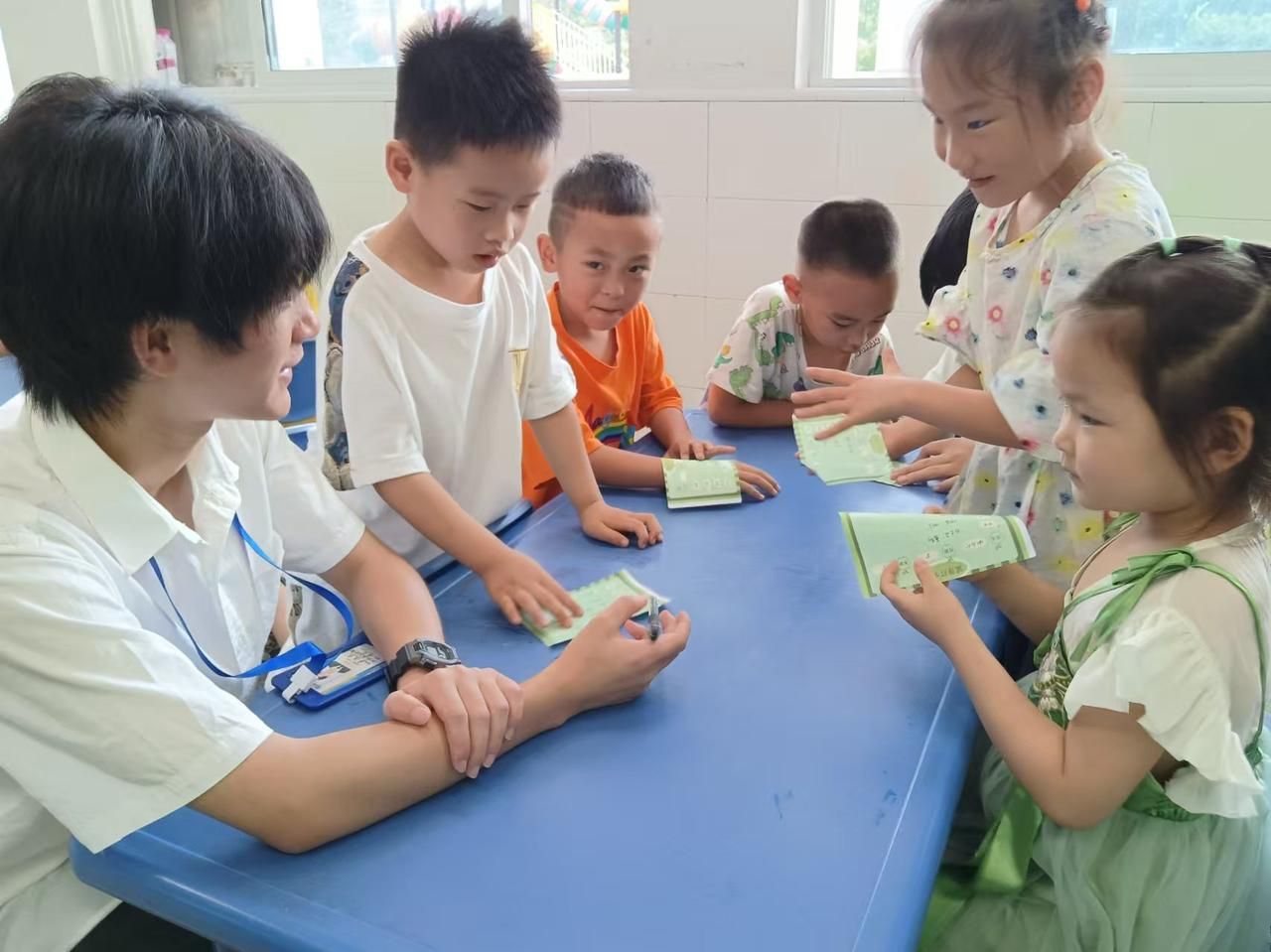 队员教小朋友写营养打卡表