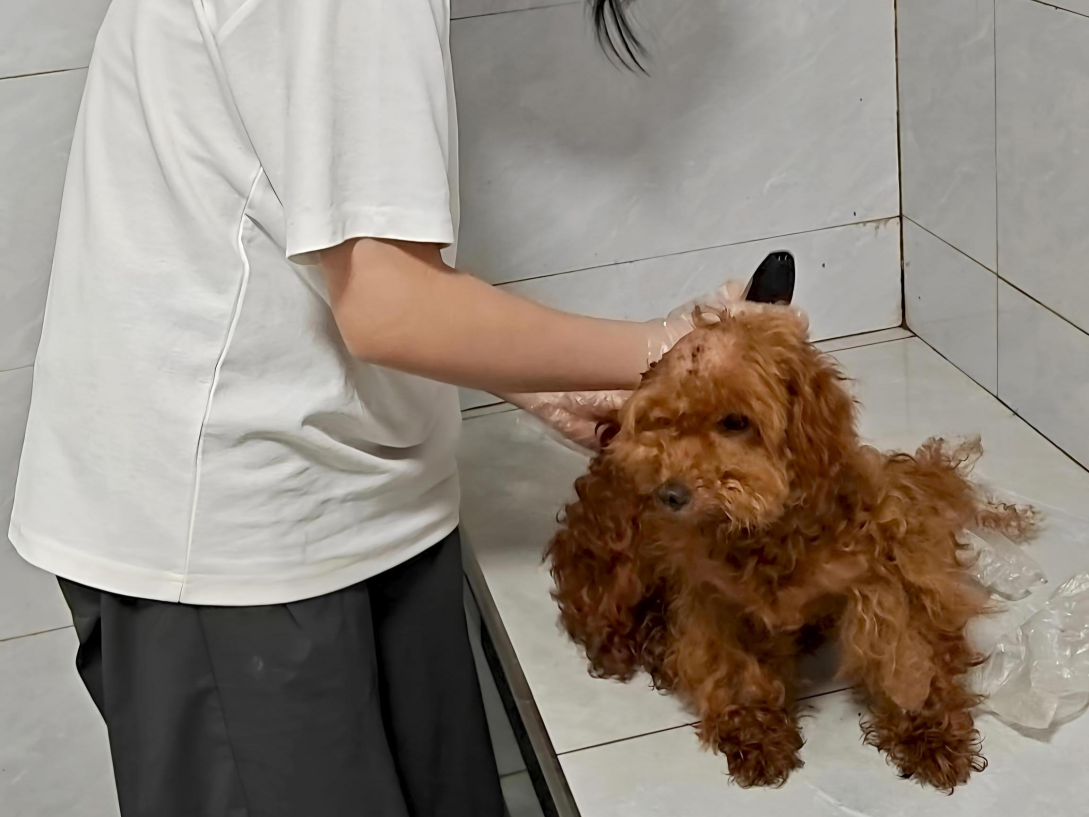 更加触动我们的是一只刚被基地工作人员救助回来的泰迪犬,该犬全身遍布伤痕与寄生虫,急需治疗。我们也有幸参与到了这次的救助行动中,在佩戴好防护装备后,我们小心翼翼地剃除脏污毛发,暴露创面以便兽医进行下一步治疗。这里的人和动物不仅仅是救助者与被救助者的关系,他们更像家人,彼此需要又彼此守候。