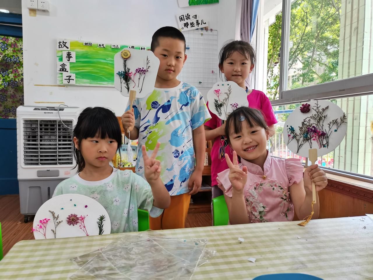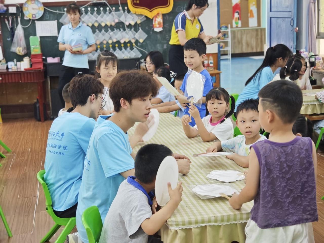 志愿者教小朋友做干花扇子
