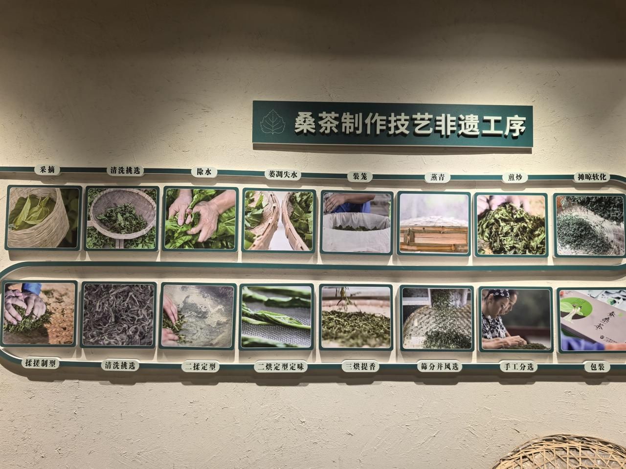 在园区负责人引荐下,队员们研读唐宋桑叶入药典籍、明清制茶工艺图谱。展柜中陈列着三百年历史的桑茶陶罐,墙上拓印着《本草纲目》的桑叶条目,“桑叶救荒,茶药同源”。队员们拍摄了百张展板资料,记录了桑茶从“清热方”到“国家地理标志产品”的历程。