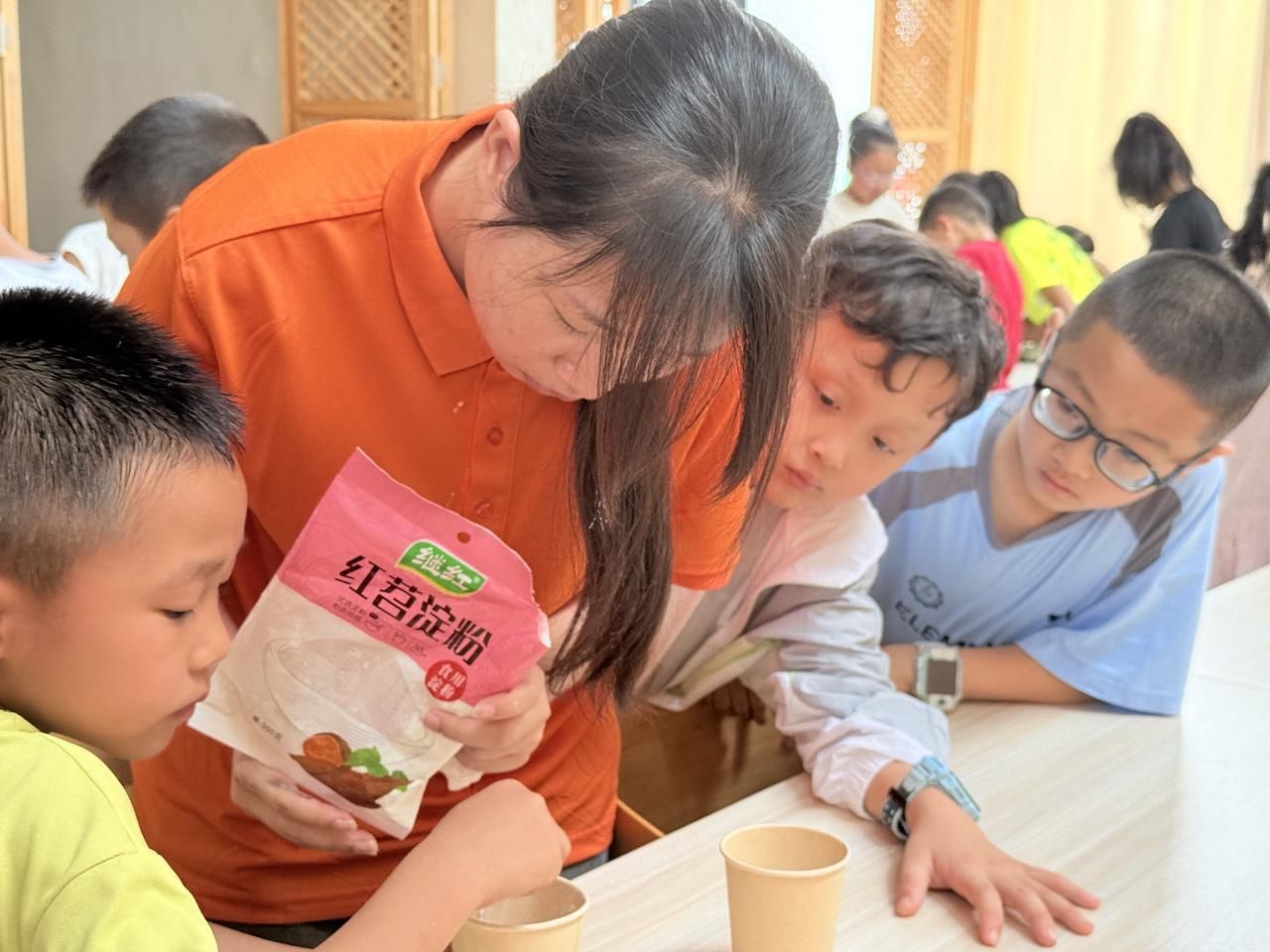 活动中,志愿者们先向小朋友们讲解了非牛顿流体的特性和制作原理,随后便带领大家动手实践。桌上摆放着红苕淀粉等制作材料,志愿者们耐心地指导小朋友们按照比例将红苕淀粉与水混合,并不停搅拌。过程中,小朋友们专注投入,有的小心翼翼地添加材料,有的认真观察混合物的变化,遇到问题时主动向志愿者请教,现场充满了欢声笑语。志愿者们还结合制作过程,生动地讲解了非牛顿流体 “遇强则强,遇弱则弱” 的科学奥秘,让孩子们在动手操作中感受科学的神奇。
