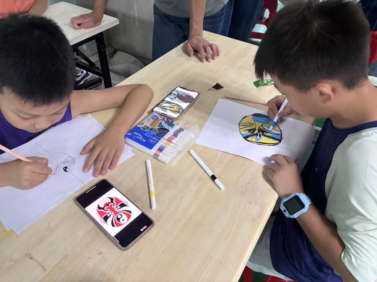活动伊始,志愿者们通过精心剪辑的《白蛇传》经典片段,将川剧的艺术感染力直观呈现。播放过程中,配合片段情节,志愿者们生动讲解川剧起源,从明清时期的戏曲融合讲起,深入阐释川剧在巴蜀文化脉络中的独特地位,让居民们对川剧有了立体认知。在随后的实践环节,志愿者引导学生以“川剧初印象”为主题绘画,准备了丰富画具,鼓励大家自由创作。孩子们或勾勒川剧人物的华丽戏服,或描绘变脸瞬间的奇幻色彩,现场氛围热烈。画作完成后,志愿者组织展示与分享,孩子们踊跃讲述创作灵感,有的从戏曲故事取材,有的因演员神态触动,通过交流,进一步深化对川剧元素的理解。
