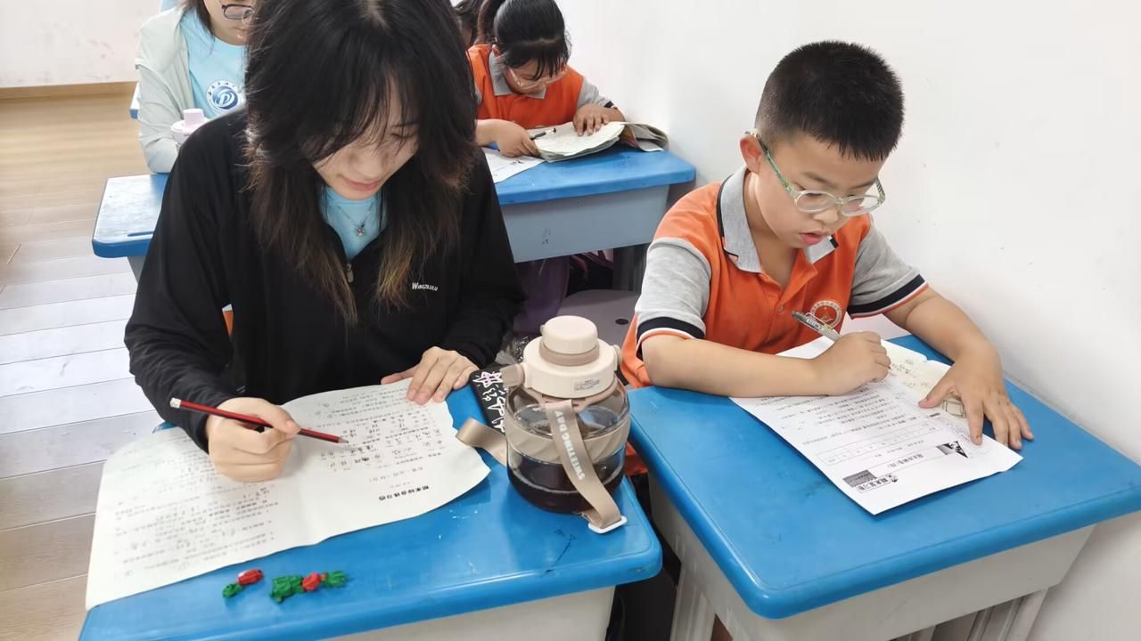 实践队成员根据学生的年级和学科需求,分组展开针对性辅导。曾越为三年级学生讲解语文作业,通过生动易懂的方式帮助学生理解课文内容;张军豪则为四年级学生订正数学作业,耐心解答疑难问题,引导学生掌握解题方法。活动中,队员们注重与学生的互动,营造了轻松愉快的学习氛围。此外,实践队还通过游戏和问答环节,激发学生的学习热情,巩固所学知识。辅导结束后,全体队员与社区老师合影留念,记录下此次活动的珍贵瞬间。
