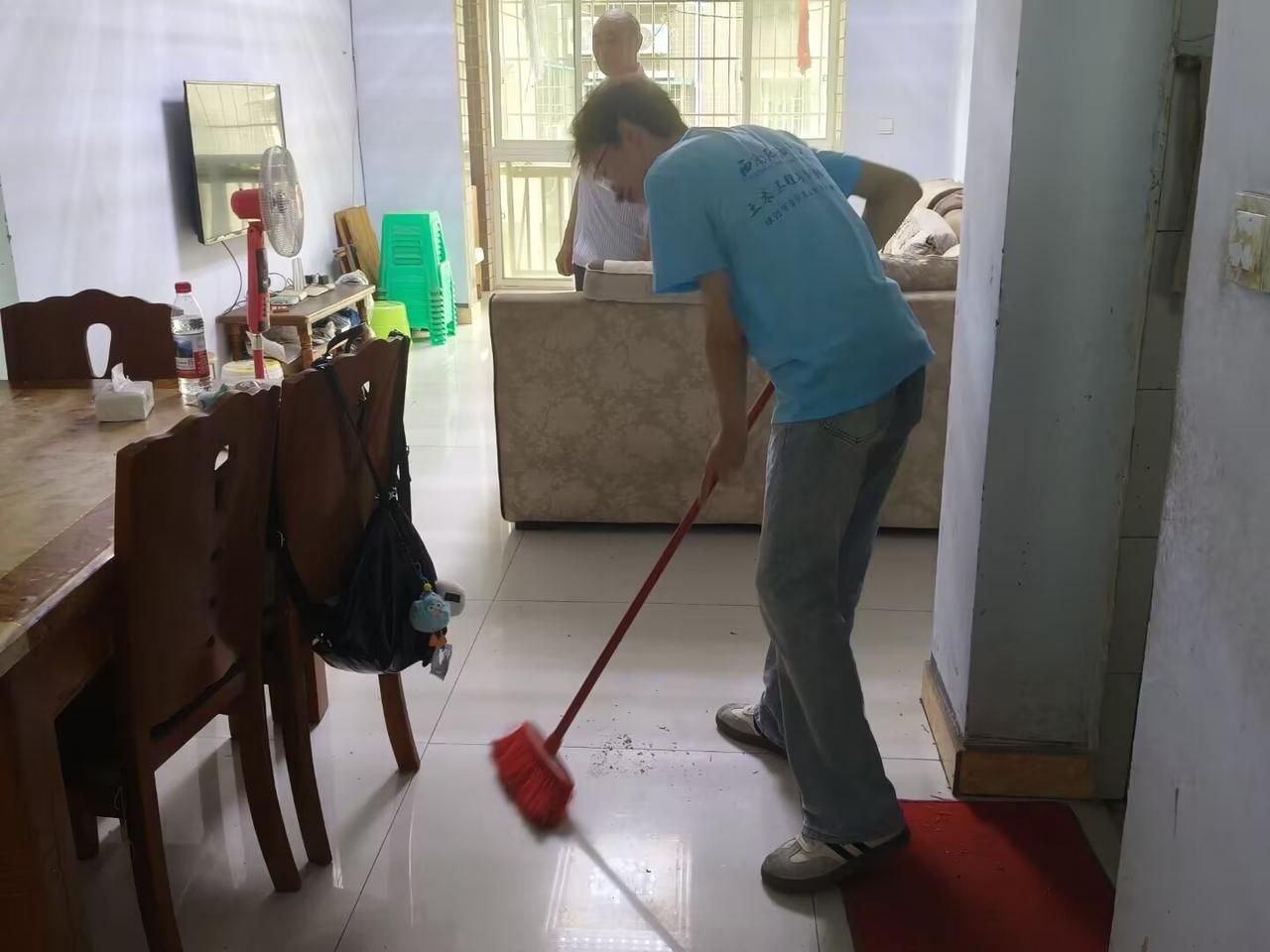 我们分成两队分别前往两户老人家中,推开第一户门时,李奶奶正坐在藤椅上看报纸,老花镜滑到鼻尖,报纸上的“神舟十八号发射成功”字样格外醒目。屋里的光线有些暗,墙角的蛛网、厨房台面上的油污,都藏着独居生活的孤单。我们没多说什么,各自拿起清洁工具:有人蹲在灶台前擦去经年的油垢,清洁剂的泡沫裹着阳光升腾;有人踮脚擦拭窗玻璃,让更多光亮涌进房间;还有人细心归置家具,把矮柜挪开半尺,让老人的轮椅能顺畅通行。最让人揪心的是老化的插座,塑料外壳已泛黄开裂,队员小心翼翼拆下旧插座,换上新的,又把纠缠如乱麻的电线一一理好——这些看不见的角落,原是藏在日常里的隐患,此刻被我们的双手轻轻抚平。