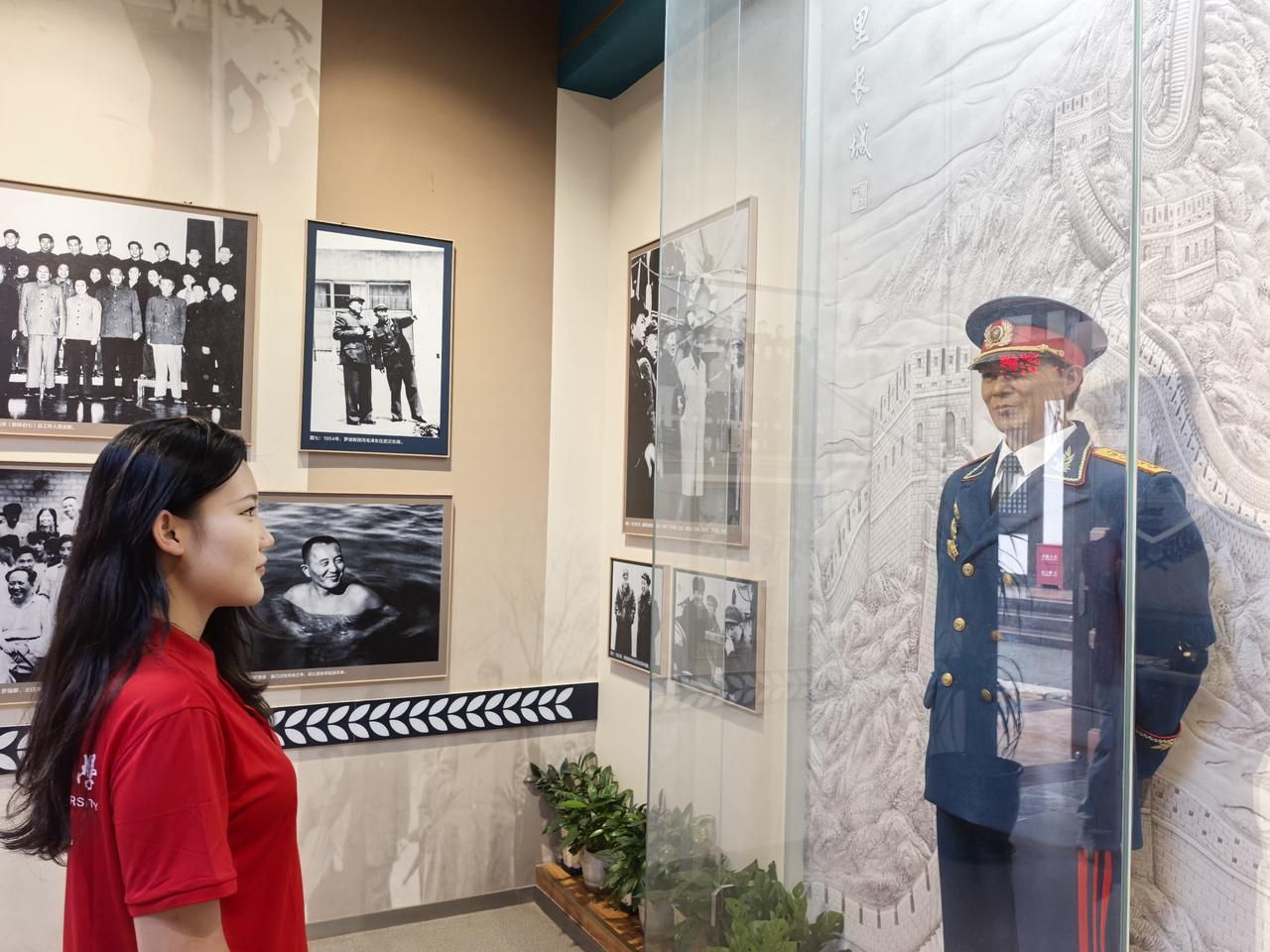 馆内光线柔和,时间在这里似乎变得粘稠而缓慢。迎面而来的是将军身着军装的雕像,背景雕刻着万里长城的灰白色壁面,古朴而厚重。仿佛在诉说一段厚重的历史与传承。他剑眉星目,眼神清澈而坚定,那是属于二十世纪三十年代青年的特有神情——没有迷茫,没有彷徨,只有一往无前的决绝。站在展柜前,我的指尖不自觉地触碰冰凉的玻璃,恍惚间竟觉得能感受到那个年代的温度。将军的皮箱、钢笔、笔记本静静地躺在透明展柜里,每一道磨损的痕迹,每一条缝补的针线都在诉说着一个热血青年的故事。