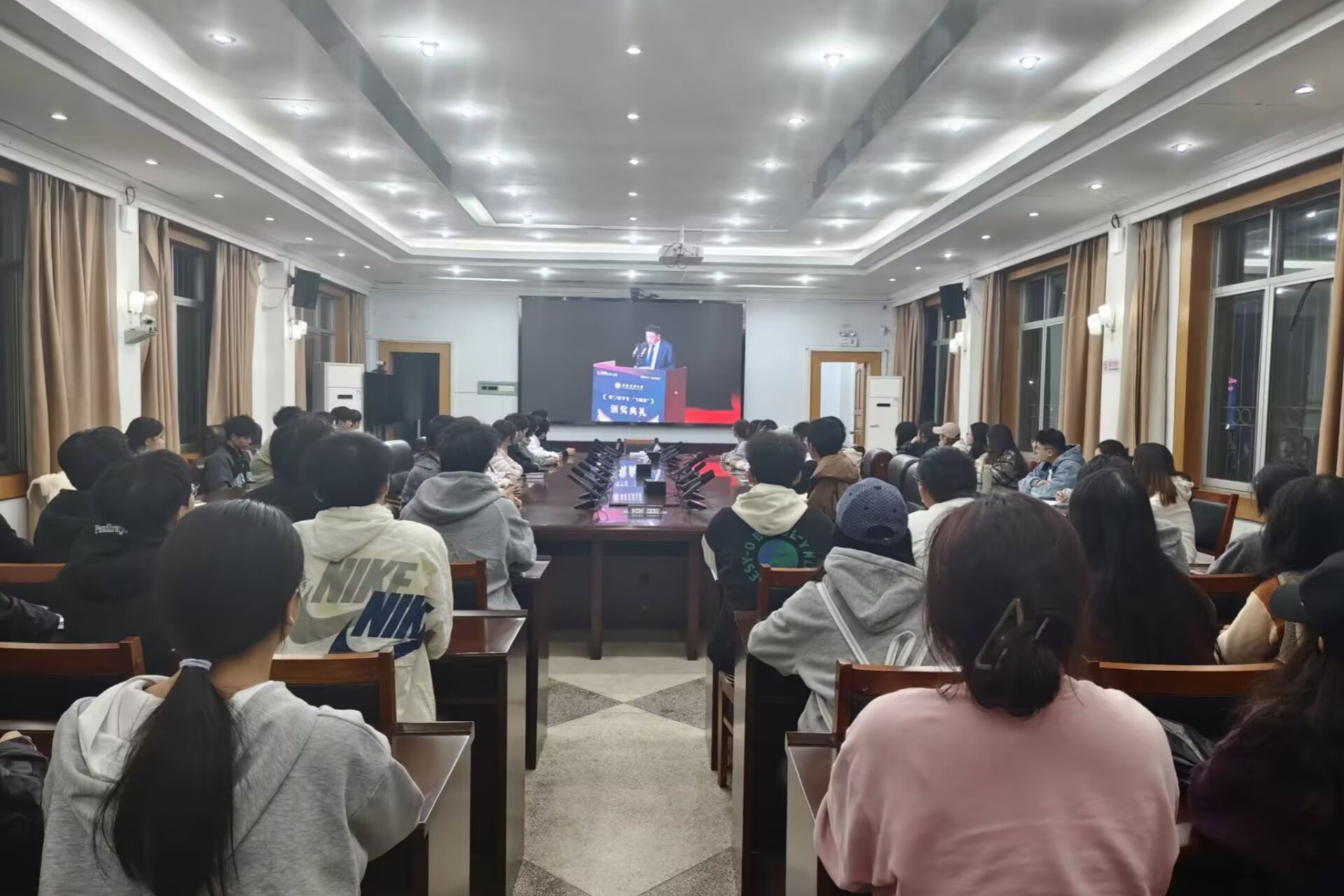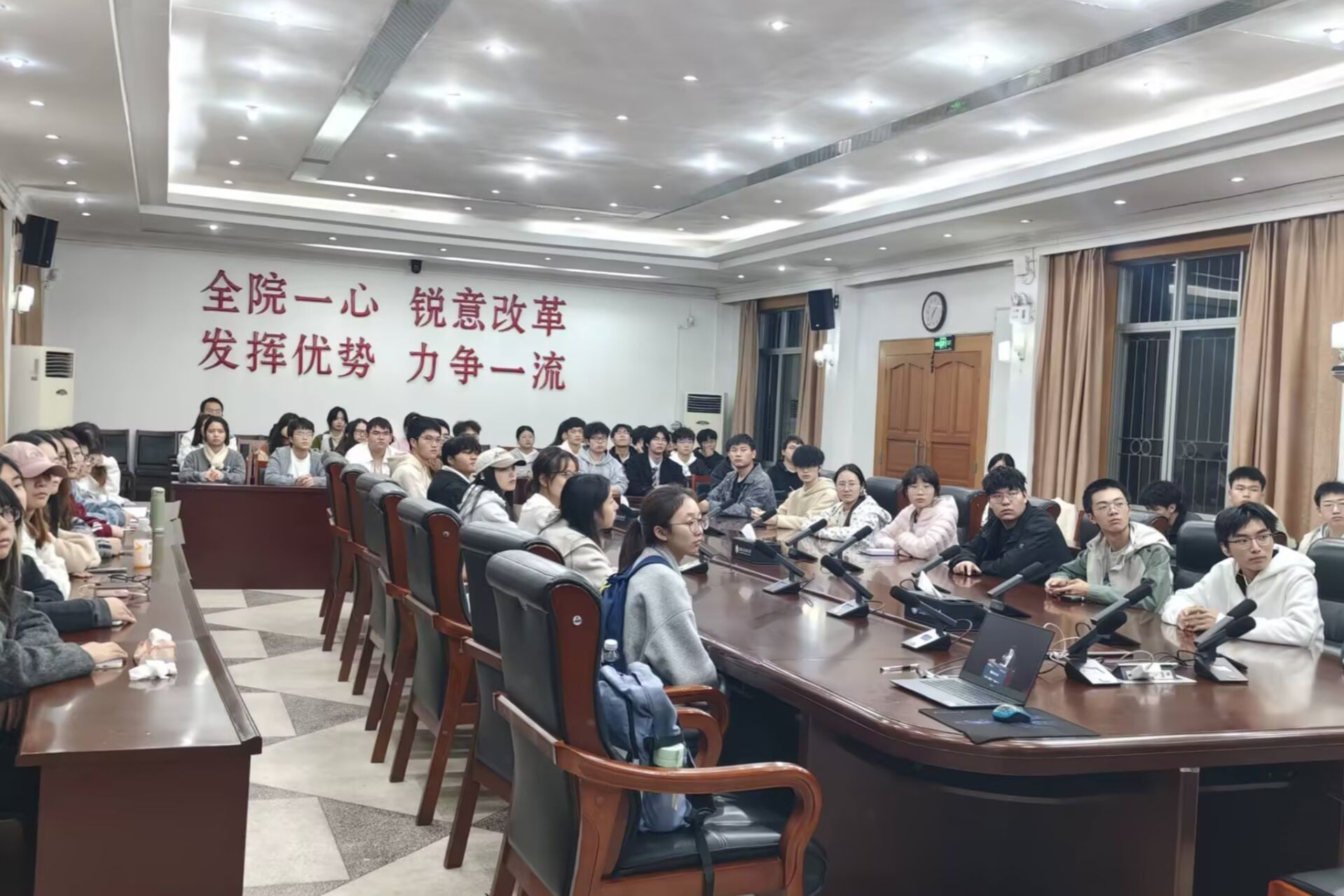 直播开始前,同学们早早到场,会议室内座无虚席。随着颁奖典礼议程的推进,现场不时响起热烈的掌声。从深耕学术前沿、在科研领域取得突破的郑南鑫、吴映和等同学,到投身创新创业实践、勇闯市场蓝海的王铱鹭、何灵等同学;从扎根志愿服务、践行社会责任的方嘉俊,到以励志精神书写人生的蒲达昌,虽然他们的事迹各有不同,但他们的“明德笃志、博学创新”的校训精神,深深触动了每一位观看学子,引发强烈共鸣。