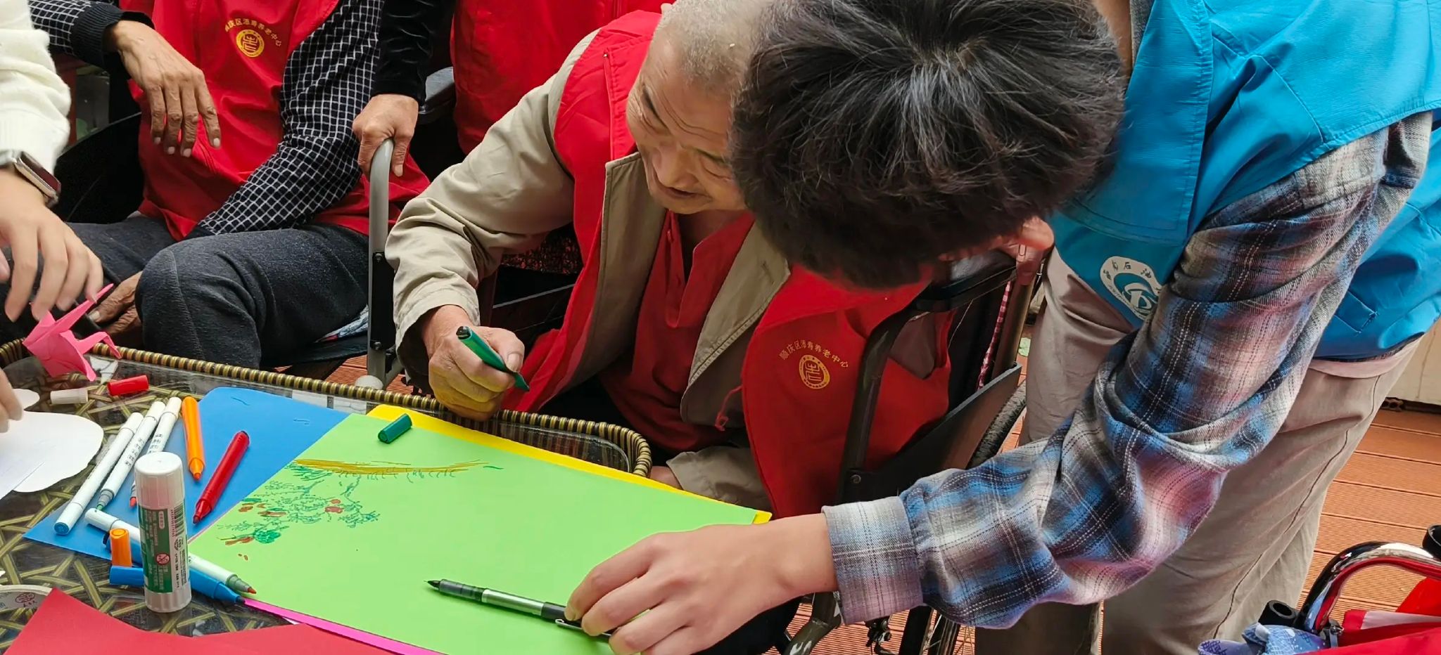 在本次活动设置的不同主题环节中,老人们或拿出珍藏的旧地图、粮票与老照片,深情讲述背后的家园故事与时代记忆;或动情分享青春往事与家庭点滴,重温岁月芳华。志愿者们用心聆听,以彩纸拼贴、绘画创作等方式将口述历史转化为“山河画”视觉作品,同时将珍贵回忆细致整理成“时光手账”,实现代际间的温情对话与记忆传承。活动期间,志愿者们还陪伴老人下棋交流、齐唱经典歌曲,并带领大家随着音乐节奏进行律动操锻炼。现场始终洋溢着欢声笑语,情感在温馨互动中持续升温。