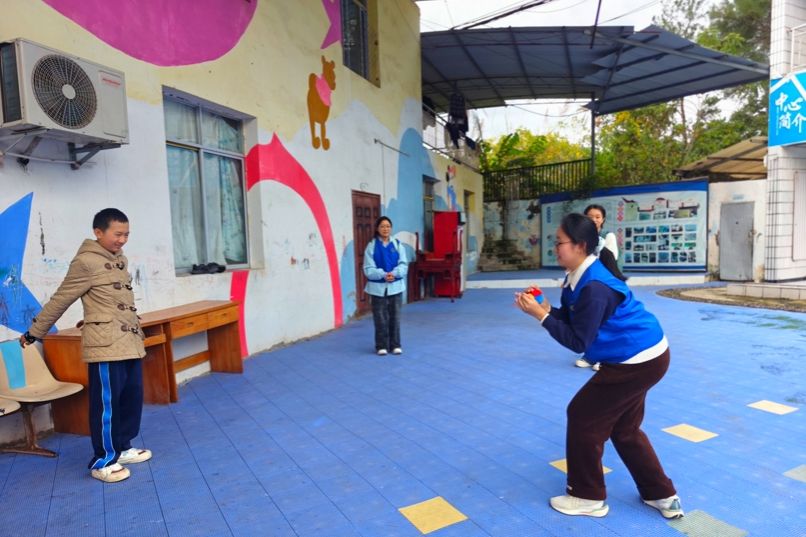 星娃与志愿者共同玩沙包