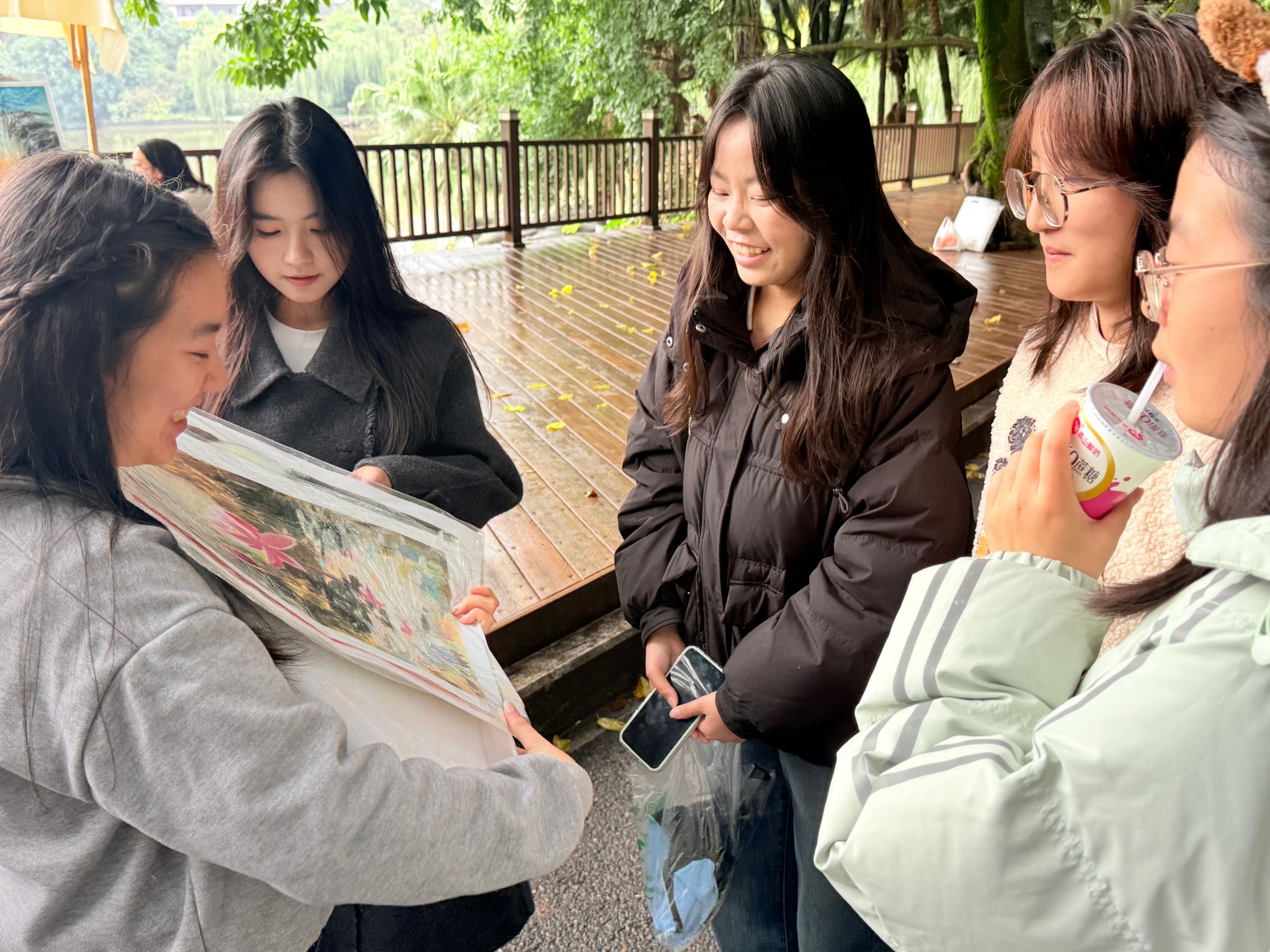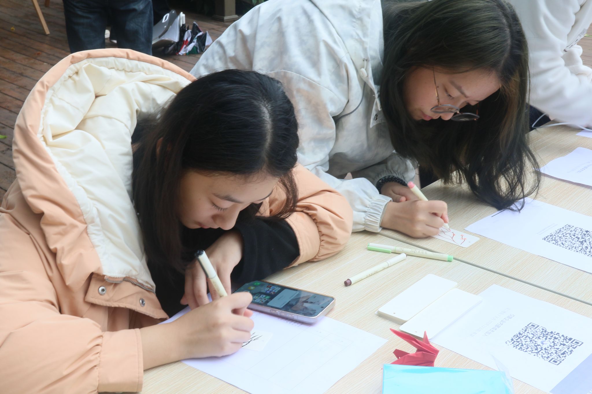 活动分为非遗刀画展览、专业讲解与现场示范以及“刀画+书法”书签DIY体验三个环节。首先,通过展出一系列以自然风光和人文场景为主题的刀画作品,同学们得以近距离观赏刀画独特的肌理变幻与艺术表现力。随后,在刀画爱好者的现场创作中,配合专业讲解员的生动介绍,同学们深入了解了刀画的多样类型与精妙刀法,切身感受到这项非遗艺术的恒久魅力。最后,在“刀画+书法”书签DIY环节,同学们亲手体验创作,将刀画的浑厚与书法的飘逸融为一体。不少同学沉浸在这场视觉与动手交织的艺术盛宴中,流连忘返。
