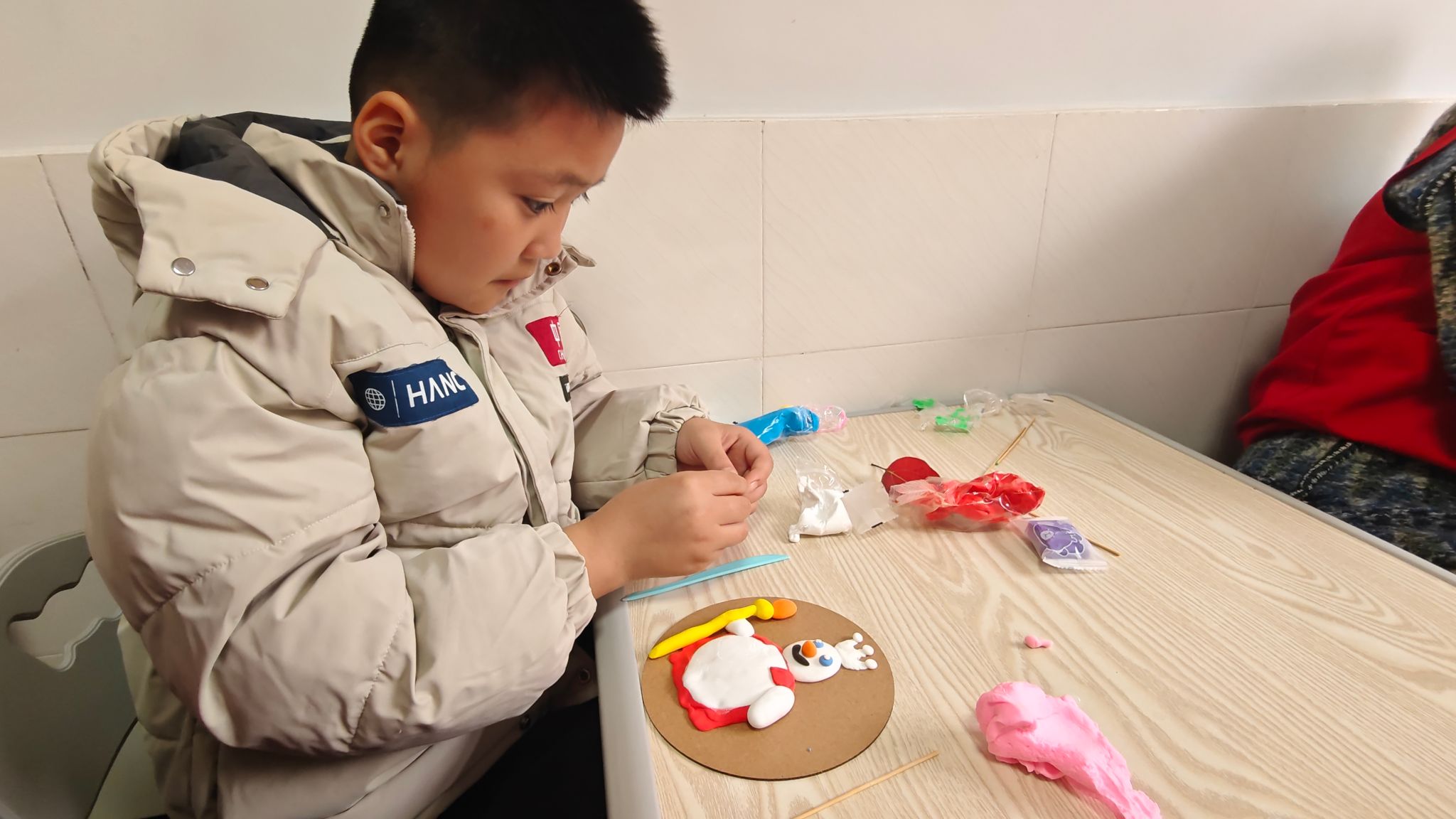 活动前期,志愿者们提前准备好轻粘土、制作工具及签到表,统一穿戴志愿者马甲赴社区集合。活动现场,志愿者们首先围绕“捡秋”主题通过手把手示范、分步讲解轻粘土技法,引导孩子们联想稻田收割、果园采摘等农耕场景。随后以一对二或一对三的结对模式全程陪伴,鼓励孩子发挥想象力并及时肯定孩子们的奇思妙想,耐心解答创作疑问,和孩子们一起制作出各具特色的“秋收组合”“捡秋场景”等作品。活动尾声,设置作品分享环节,孩子们踊跃走上前,讲述自己作品背后的创意和想象。最后,部分优秀作品被陈列在社区活动室进行展示,其余由孩子带回家珍藏。